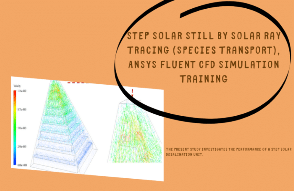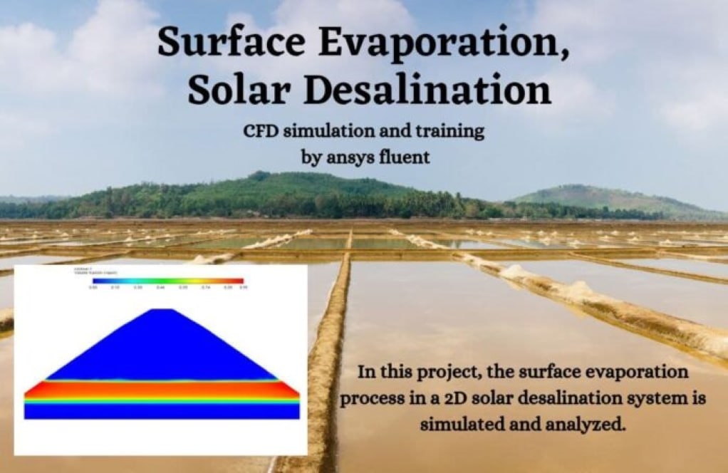In project number 8, the surface evaporation process in a 2D solar desalination system is simulated and analyzed. In this process the surface of the fluid water will receive the warmth of solar rays, then based on the principles of surface evaporation, the water molecules on the surface of the water will start to evaporate. Finally, when the gauge pressure and temperature of water vapor reach 3000 Pa and 343.15 K respectively, it will leave the desalination system through the defined pressure outlet. Study number 9 investigates the performance of a STEP solar desalination unit. The present model consists of a small chamber with a sloping glass surface on both sides and steps within it, where saline water flows on the surface of these steps. Solar radiation heat transfer passes through the glass to the surface of the water in the enclosure to evaporate the water surface on the step walls.