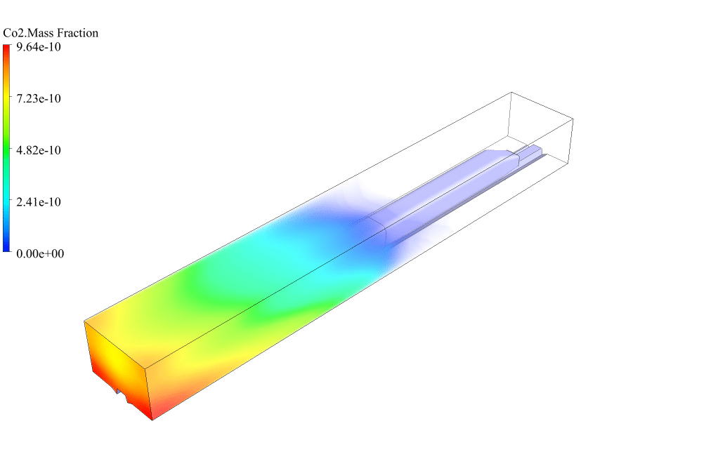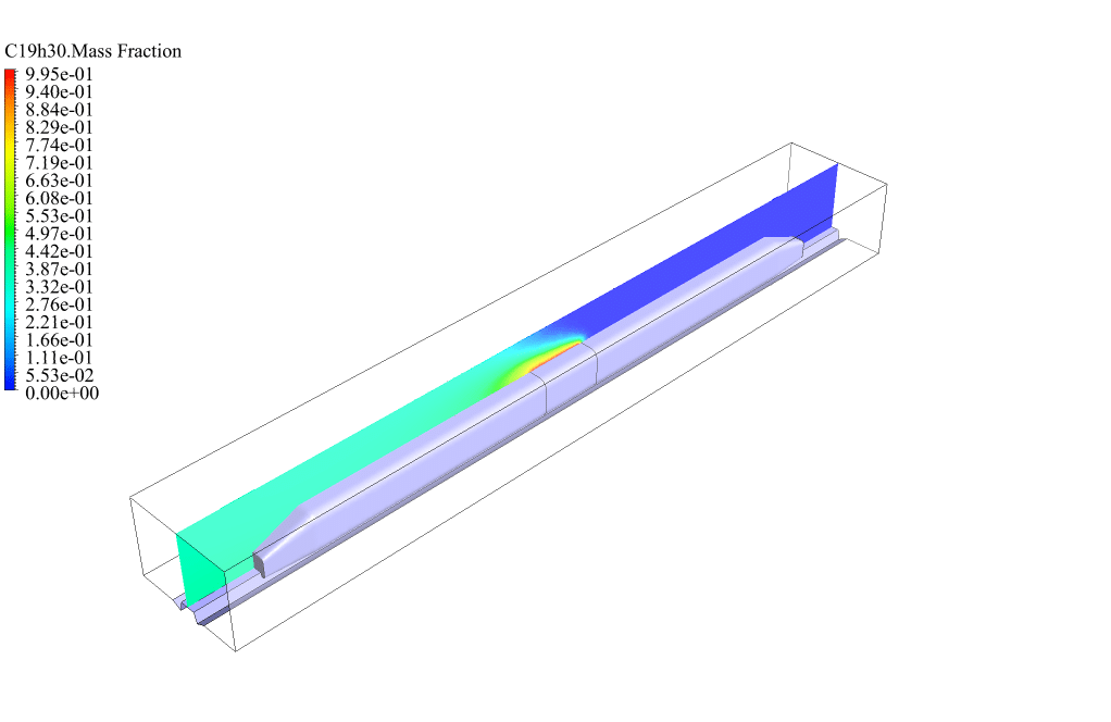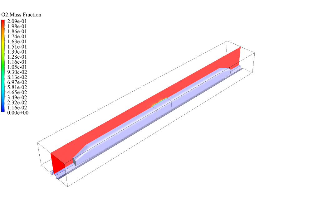 The results show that the combustion reaction happened correctly on the outer body of the train. Fuel leaks from the train body and reacts with oxygen in the open air. This combustion reaction leads to the production of carbon dioxide and a significant amount of thermal energy.
