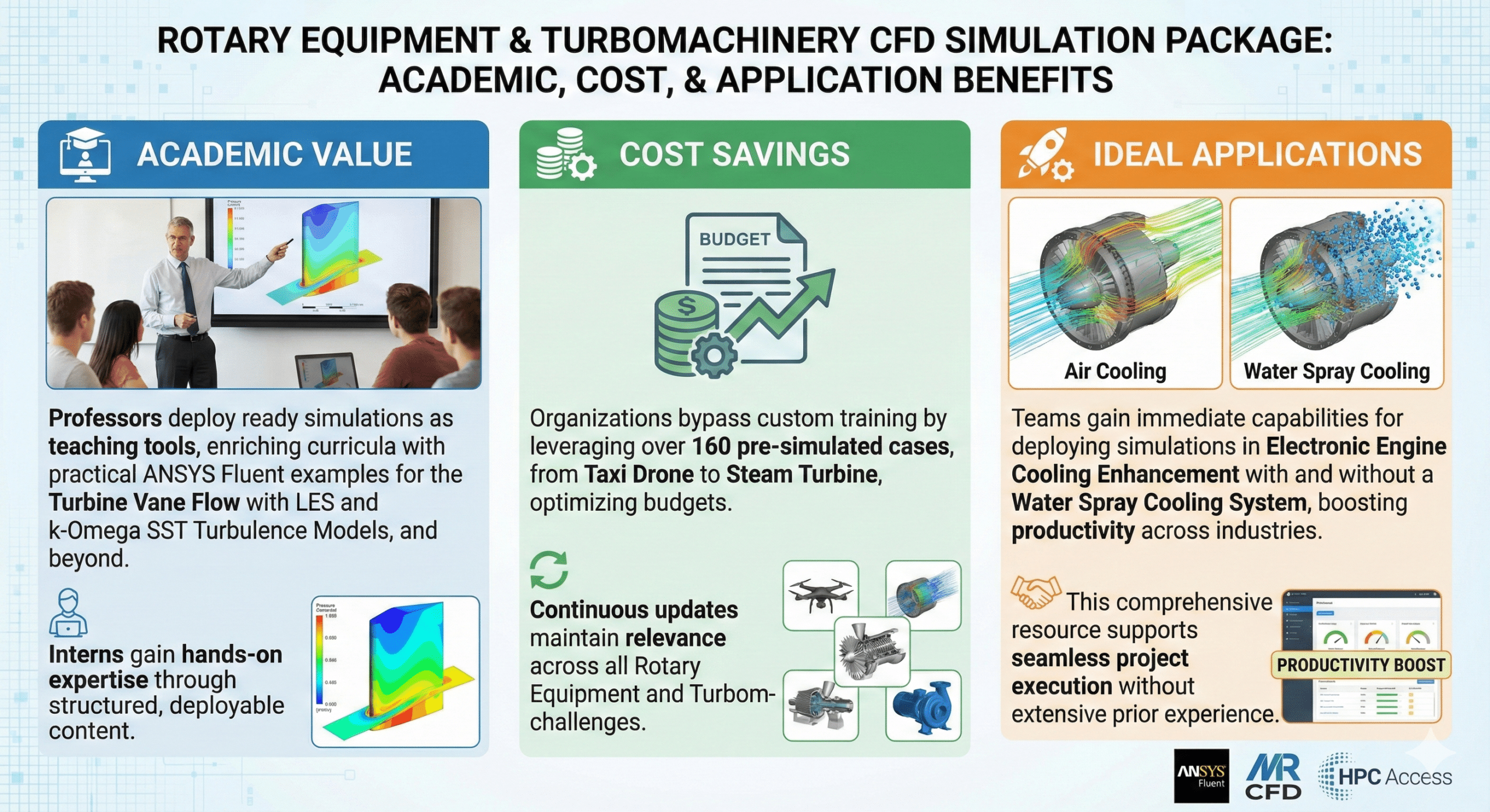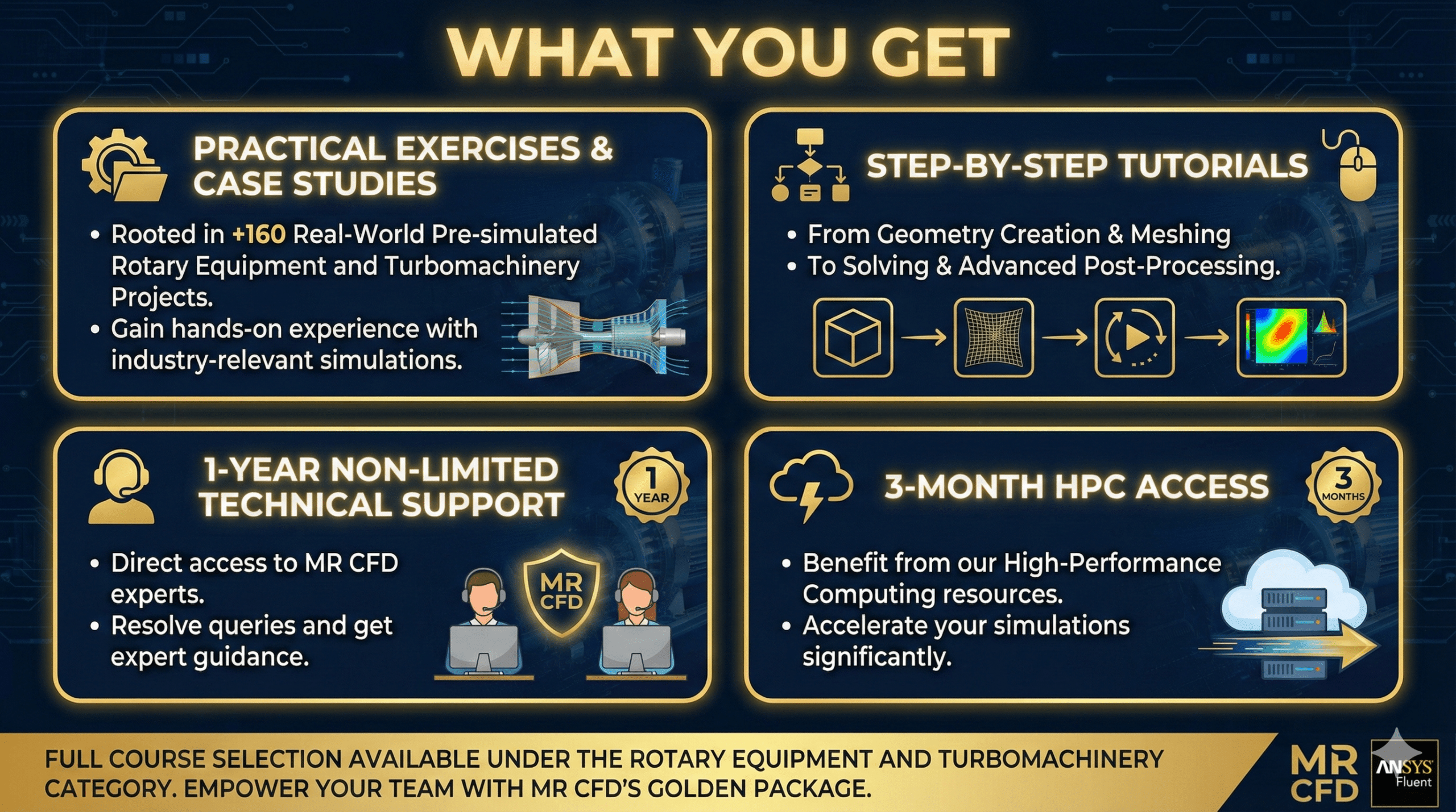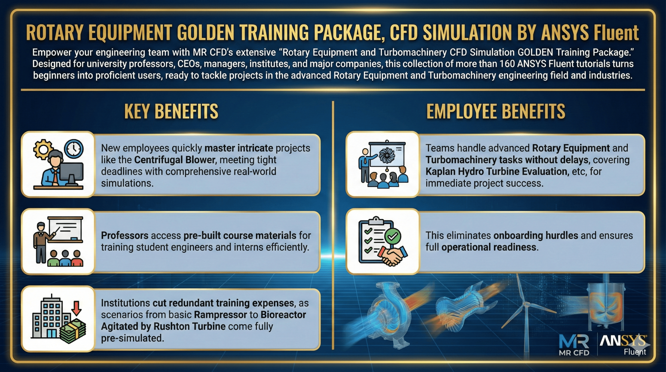 MR CFD’s Rotary Equipment & Turbomachinery CFD Simulation GOLDEN Training Package offers 160+ ANSYS Fluent tutorials on pumps, compressors, turbines (gas, water, wind), fans, mixers, and rotary dryers—ideal for professors, managers, and companies upskilling teams in turbomachinery design.