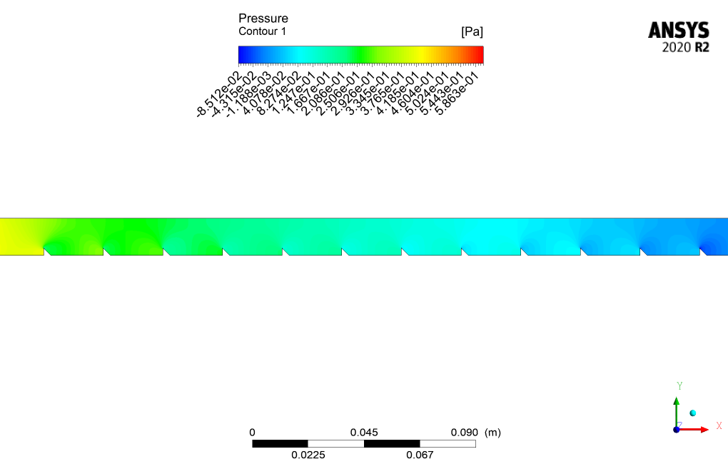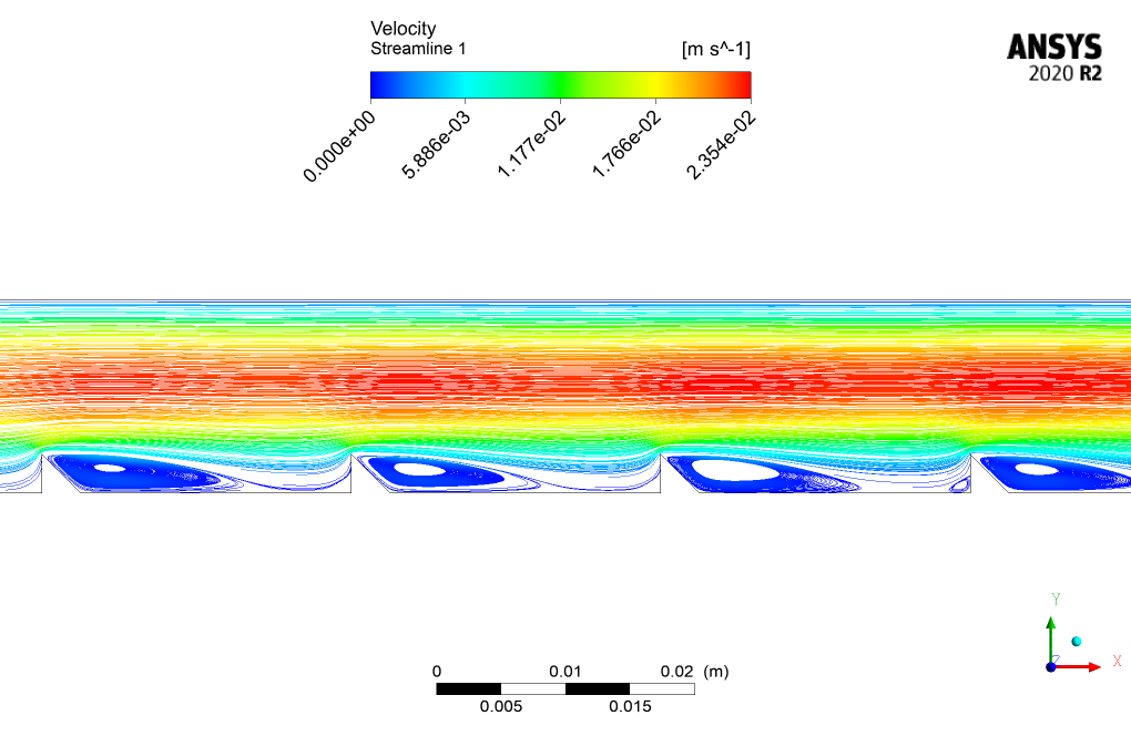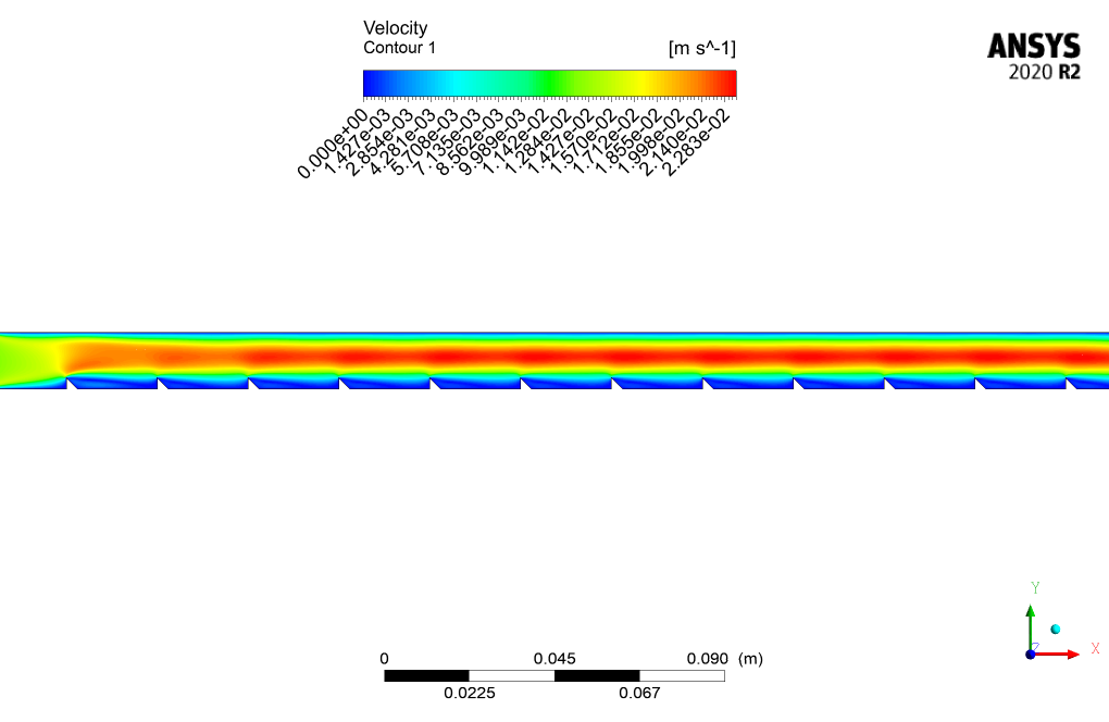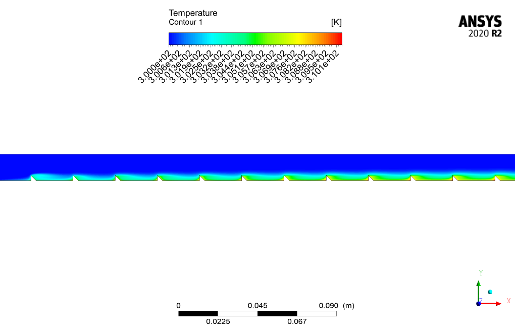 As shown in the temperature contour, the fluid temperature has increased after passing over the lower wall’s serrated fringes. These fringes have the role of changing fluid flow regime from Laminar to turbulent for purposes like increasing the total heat transfer.