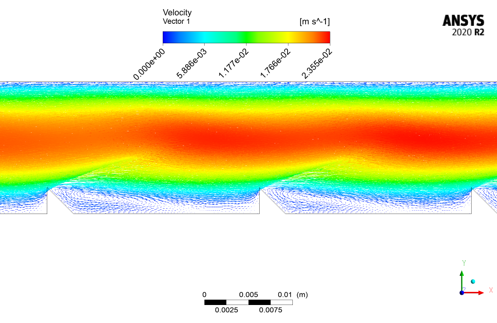 In this project, the heat transfer process on a rough surface having small serrated fringes is analyzed and simulated by ANSYS Fluent software. The water flow enters the channel with a velocity of 0.0134 m/s, and since the water flow does not have a high Reynolds number, the Laminar model was used to solve fluid flow equations. The energy model is also exploited to calculate the temperature distribution inside the computational domain.