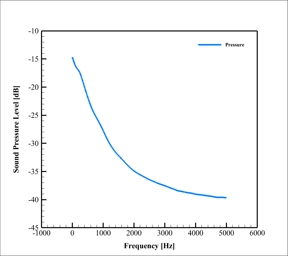 SPL (Sound Pressure Level) graph is obtained by applying a Fourier transform (FFT) to the time domain signal and shows the noise characteristics in the frequency domain. No frequency filtering is applied here. The graph starts with a relatively high level at low frequencies (about -15 dB at frequencies near zero) and then decreases slowly and uniformly with increasing frequency, reaching about -40 dB at 5000 Hz.