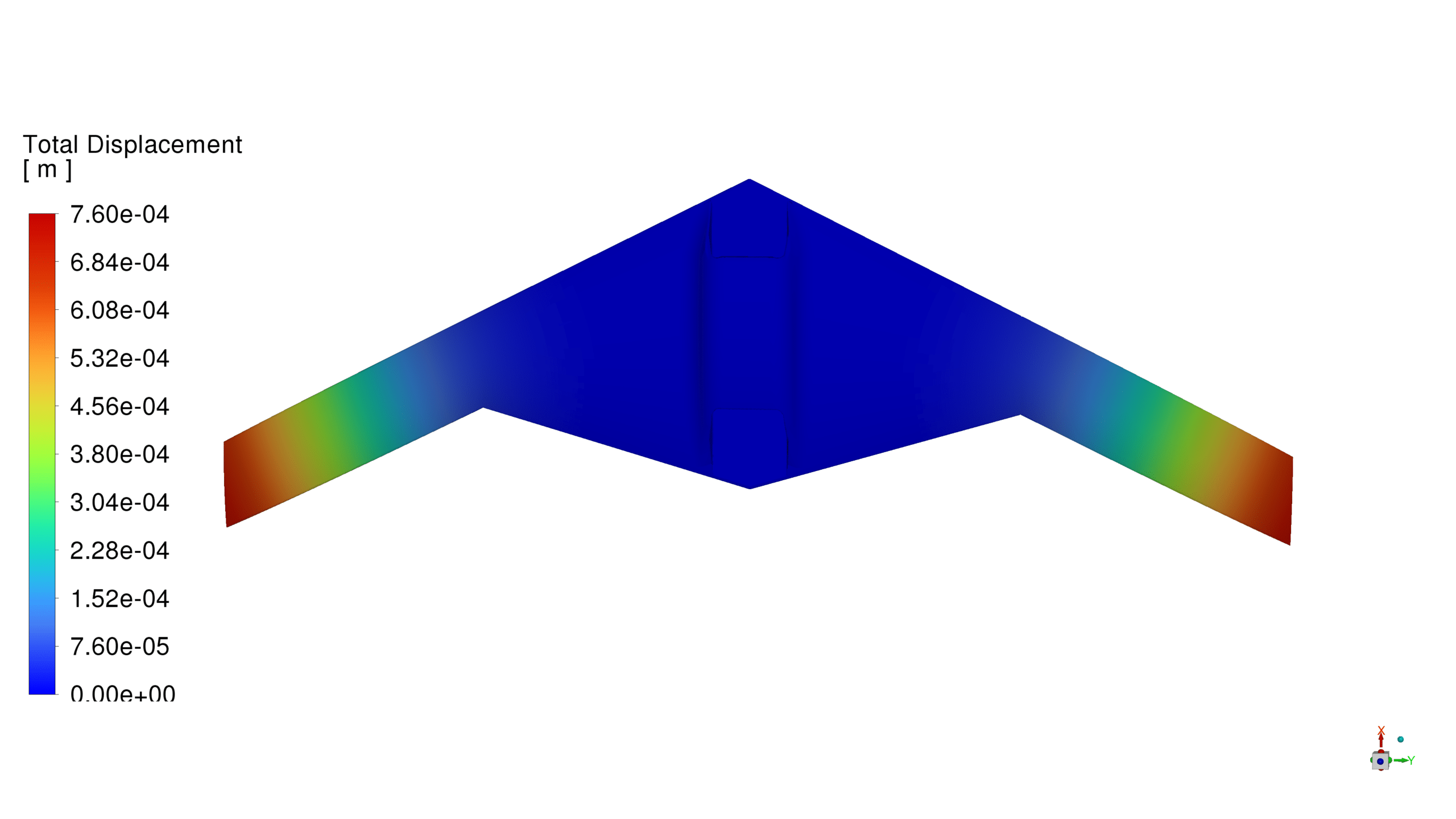 According to the extracted contours, it is observed that, as expected, the greatest displacement occurs at the wing tips of the UAV and the greatest stress is at the wing-body connection.