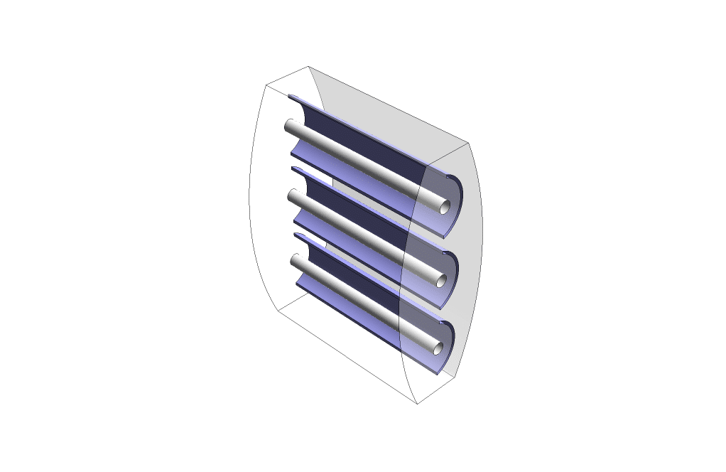 We designed the geometry of the model in 3D using Design Modeler software. The computational domain of the model is related to the interior space of a radiative space heater. This heater consists of several heating cylinders, and behind each of them, parabolic plates are used as heat reflectors.