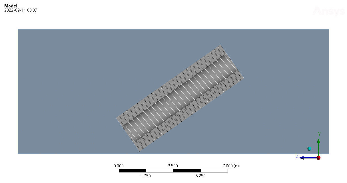 The Mesh Motion method is enabled to simulate the rotational motion of the pump. To model different phases of the solution, the Volume of Fluid (VOF) model is selected. The Open Channel model is also used to define the open channel boundary condition. Definitive density is equivalent to air density, i.e., 1.225 kg.m-3. The simulation is Transient.