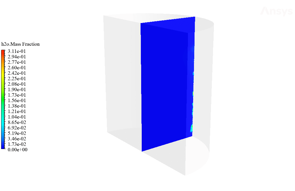 After calculation, 2D and 3D contours related to temperature, pressure, and velocity are obtained. The contours show that the moisture or h2O in the seeds inside the chamber decreases by moving the hot air stream upwards.