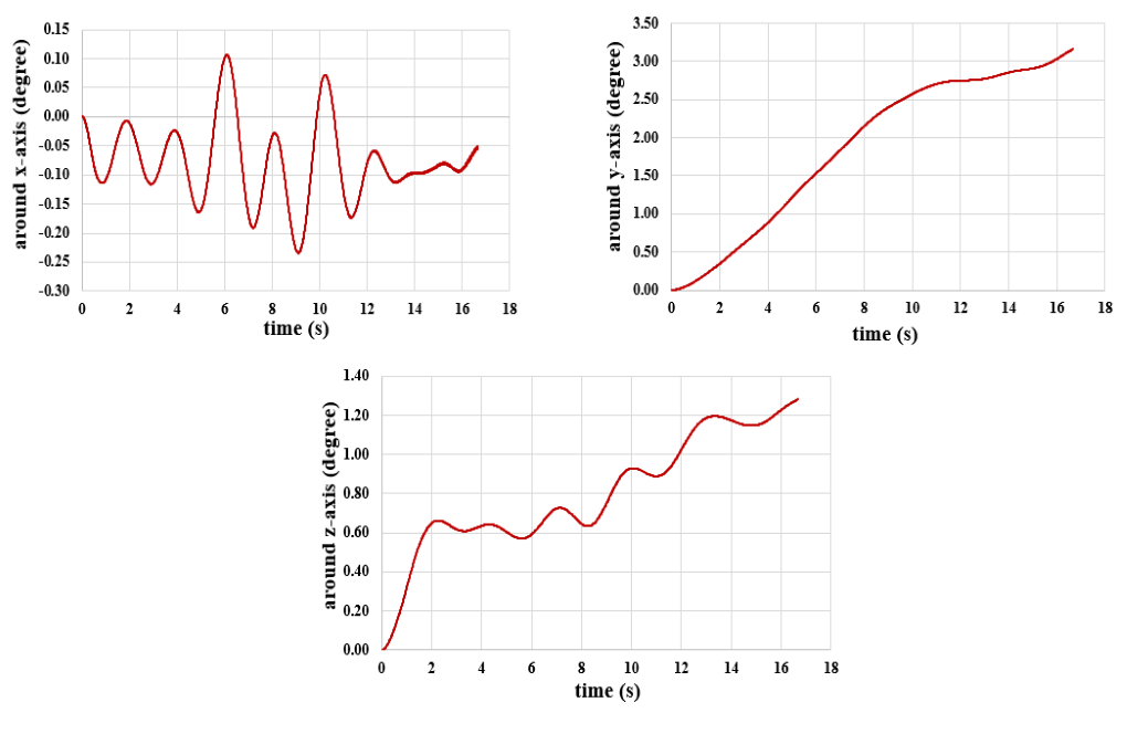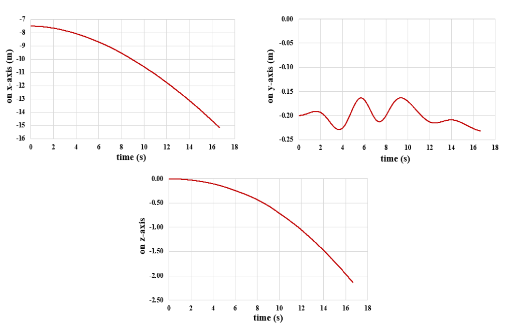 We present these contours in two planes, X-Y and Y-Z, and in the last second of the simulation process. Also, we show the diagram of the amount of submarine transitional and rotational movement in the direction of all three axes, X, Y, and Z.