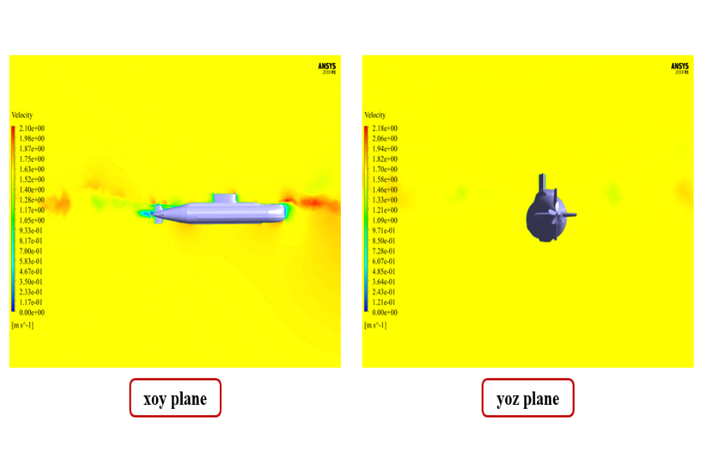 At the end of the solution process, we obtain two-dimensional contours related to the velocity and volume fraction of each air and water phase in the floating submarine areas.