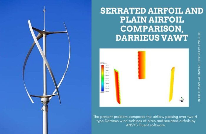 The present problem compares the airflow passing over two H-type Darrieus wind turbines of plain and serrated airfoils by ANSYS Fluent software. We perform this CFD project and investigate it by CFD analysis.