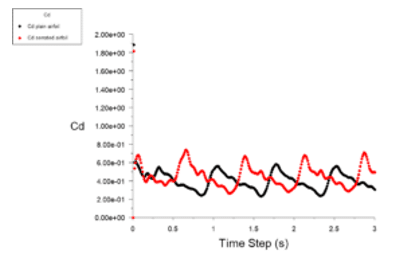 Next, if we investigate the changes in drag, lift, and power coefficient, we may observe a slight increase in drag force exerted on serrated airfoils compared to the plain ones, which seem to be due to the increased surface of the airfoils.