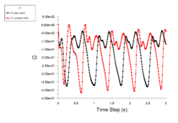 The following graph is related to the lift coefficient, showing a slight increase in the generated lift force when we use the serrated airfoils for the vertical axis turbine. The reason can be behind the more smoothed pressure distribution over two surfaces of a single airfoil.