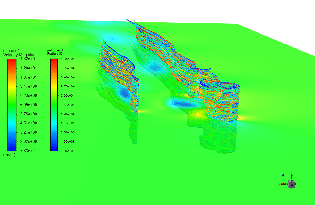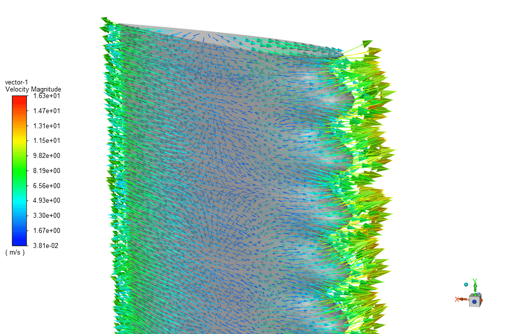 In this project, the airflow enters the computational domain with a velocity of 7m/s, and we apply the RNG k-epsilon model to solve the turbulent flow equations.