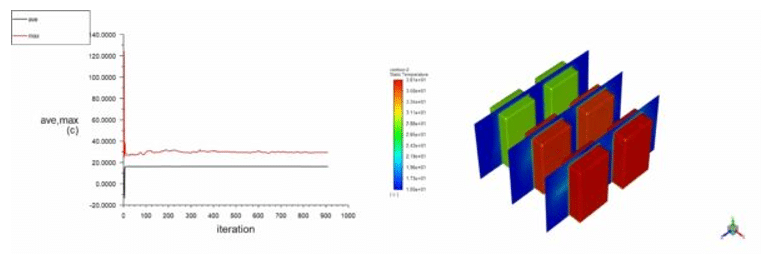 In this simulation for server room cooling, several techniques were utilized to maintain a stable temperature within the safe range. The air inlet’s specified temperature was 15 degrees and the airflow velocities were 0.5 and 1 meter per second to regulate the temperature effectively. Each cabinet rack was also modeled to generate 400 watts of heat, and a structured mesh was implemented for precision. With adjustments to the input airflow speed, we were able to keep the maximum temperature within the recommended limit of 32 degrees, ensuring effective cooling for the server racks.