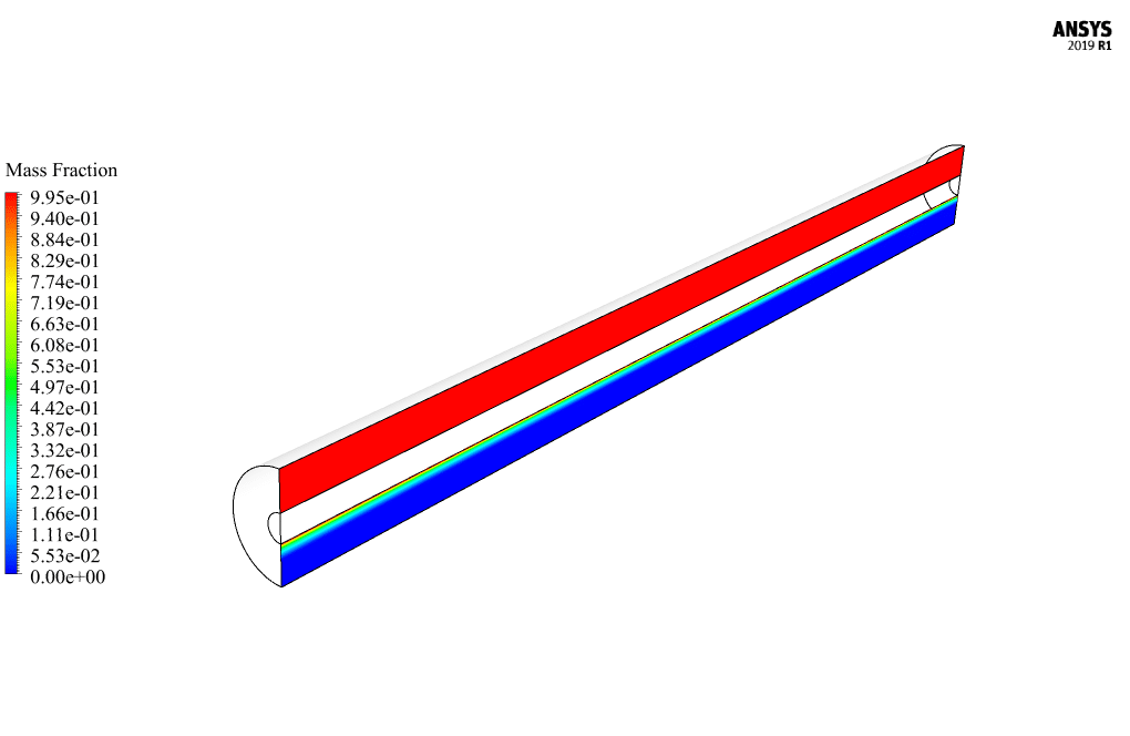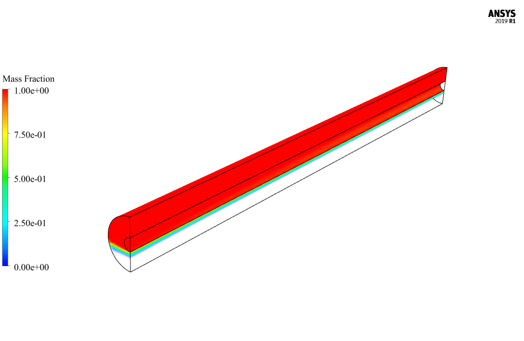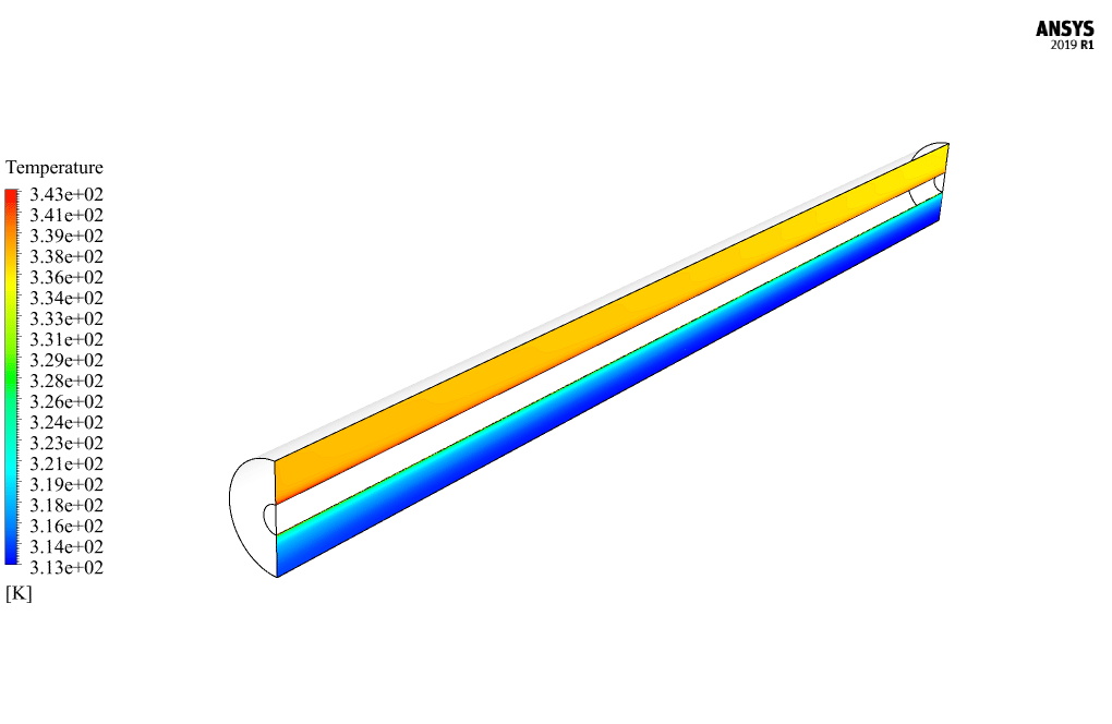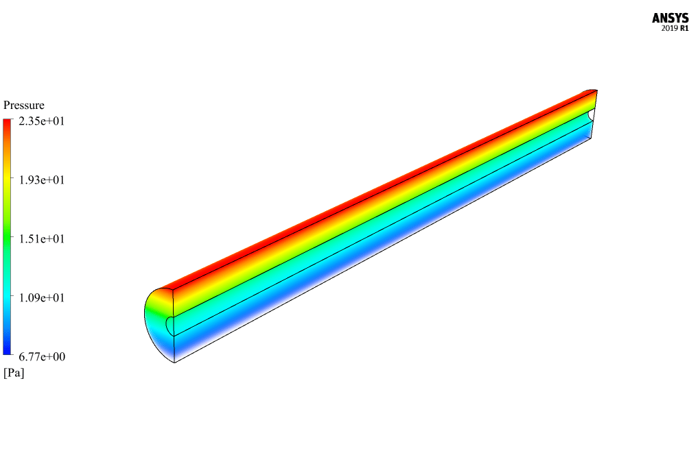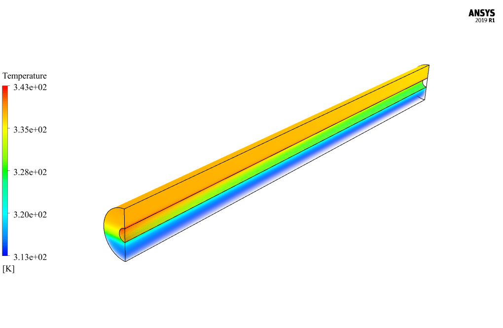 The pipe has a length of 1 m horizontally, and its inner and outer radii are 0.011 m and 0.0425 m, respectively. Due to the symmetrical structure of the pipe and to reduce the computational cost, a half geometry should be modeled.