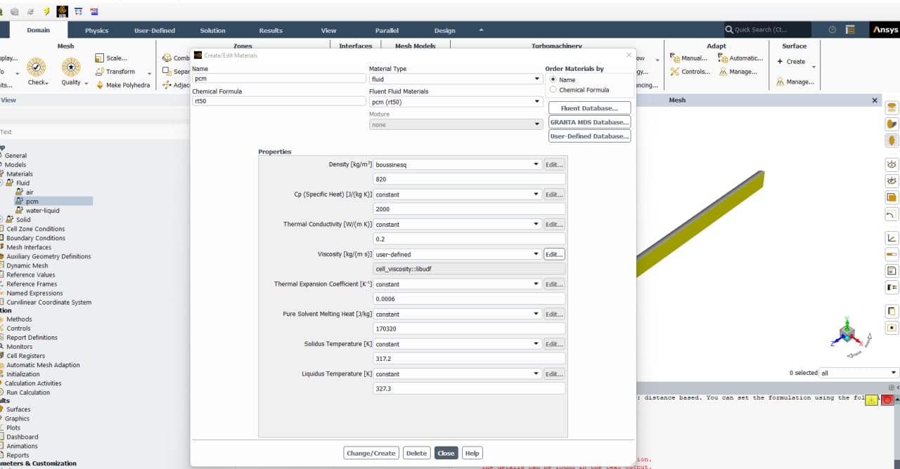 Also, the viscosity of the phase change material depends on the temperature and is defined as a temperature-dependent exponential function in the form of a UDF function.