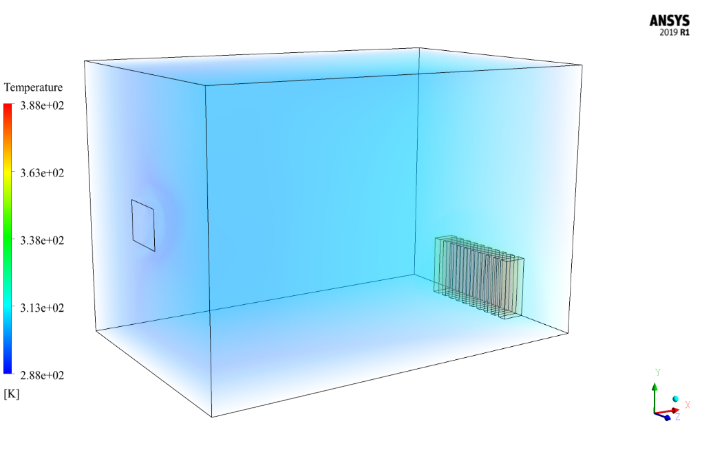 The aluminum radiator generates heat energy with an output of 23469 W.m-3 and acts as the main heat source in the room. As a result, it creates a thermal plume of rising hot air due to its higher temperature compared to the cold air within the room. This induces a convective flow that drives the air upwards and towards the outlet window, hence disturbing the temperature distribution throughout the space. The effect of the radiator introduces a temperature gradient, warmer near the heater and cooler away from it.