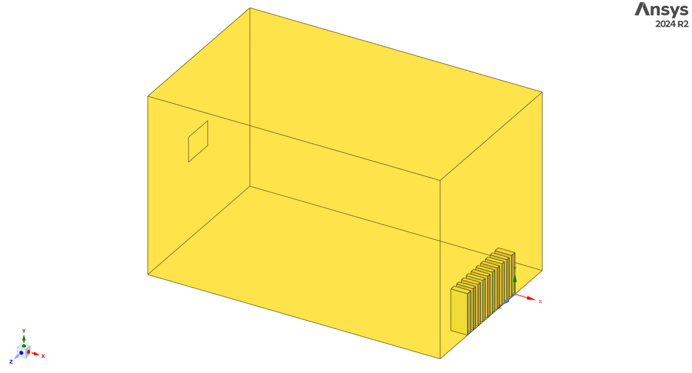 The 3-D geometry of the Single Sided Ventilation in the room is designed using Ansys SpaceClaim software. The model consists of a room measuring 2.13 m ⨯ 2.15 m ⨯ 3.32 m, with a rectangular cube heater at the bottom of one of its sidewalls. The following figure shows the geometry.