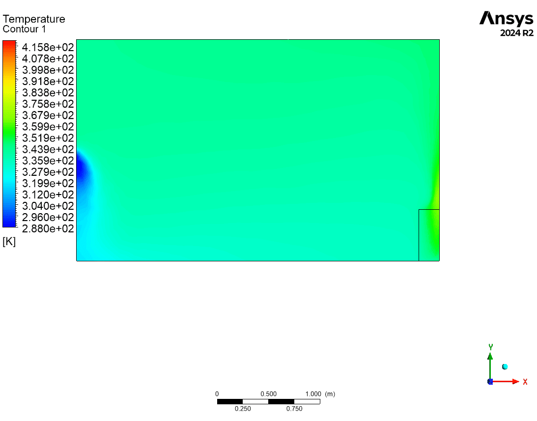 Yes, precisely. The results, like temperature contour plots, help visualize and understand how heat from the aluminum radiator (heater) affects the air temperature distribution within the room, ensuring that the heating system is efficient and revealing the effectiveness of single-sided ventilation in maintaining thermal comfort. Additionally, velocity contours and vectors offer insights into the airflow patterns due to natural convection and ventilation flows.