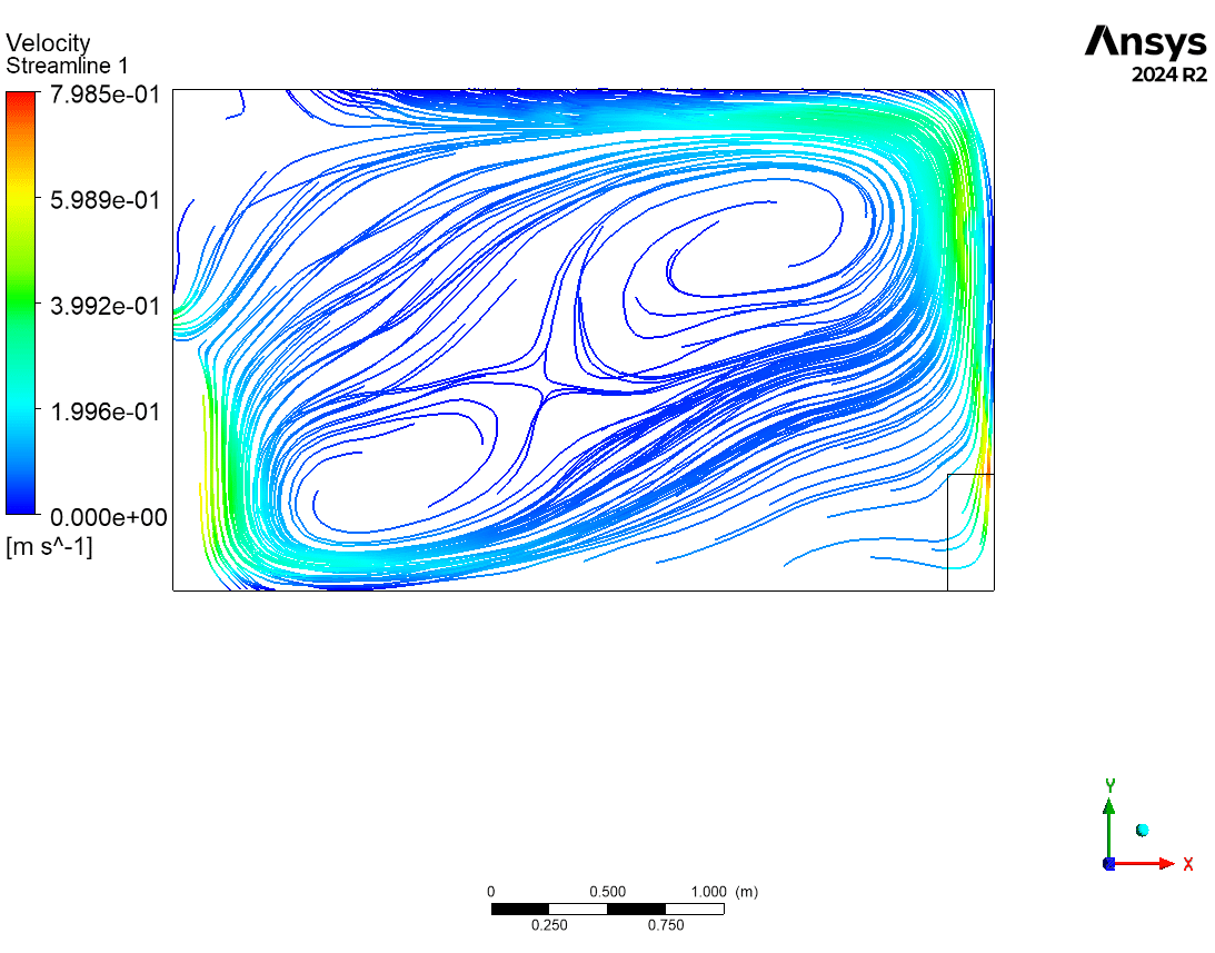 – Flow Pattern: A steady single-cell clockwise circulation develops, with maximum velocities of 0.8 m/s in the boundary layers near the vertical walls