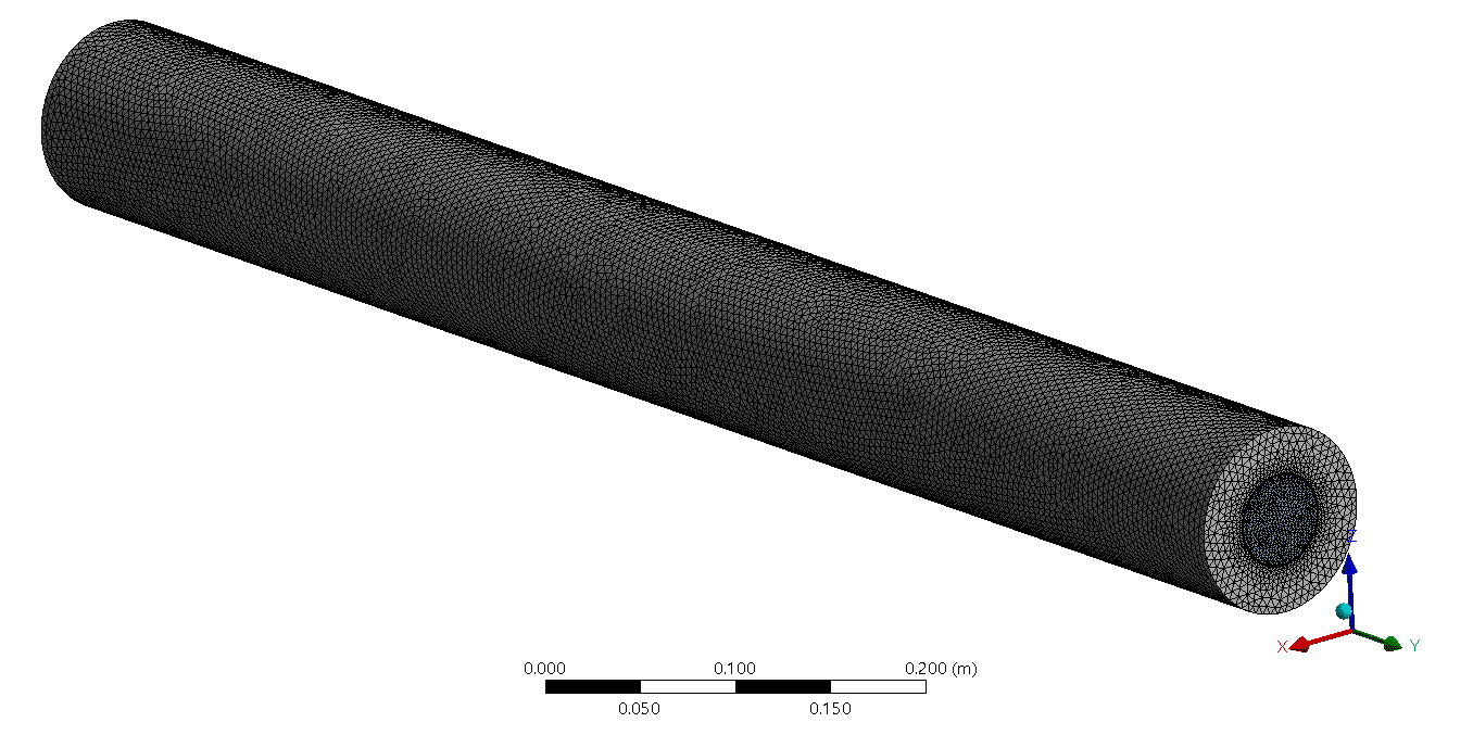 In this simulation, the reactor tube is modeled using ANSYS Fluent software. The simulation’s geometry was created with Design Modeler software, and all the necessary data was provided. We used ANSYS Meshing software to generate a mesh grid and chose an unstructured grid with tet elements. We ensured the boundary layer had five orthogonal elements, resulting in 4,255,042 elements.