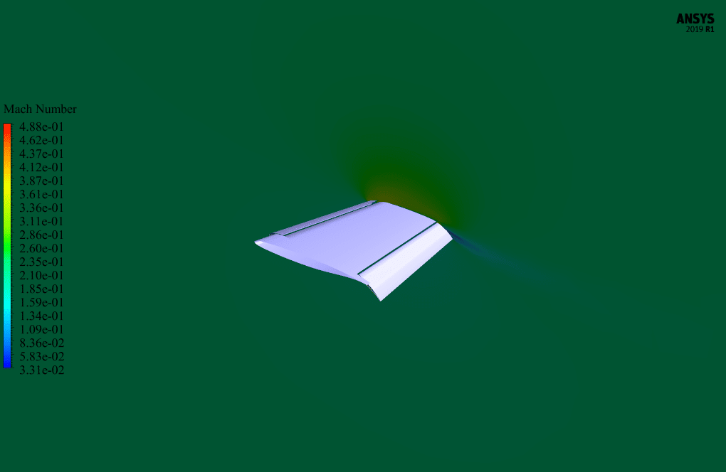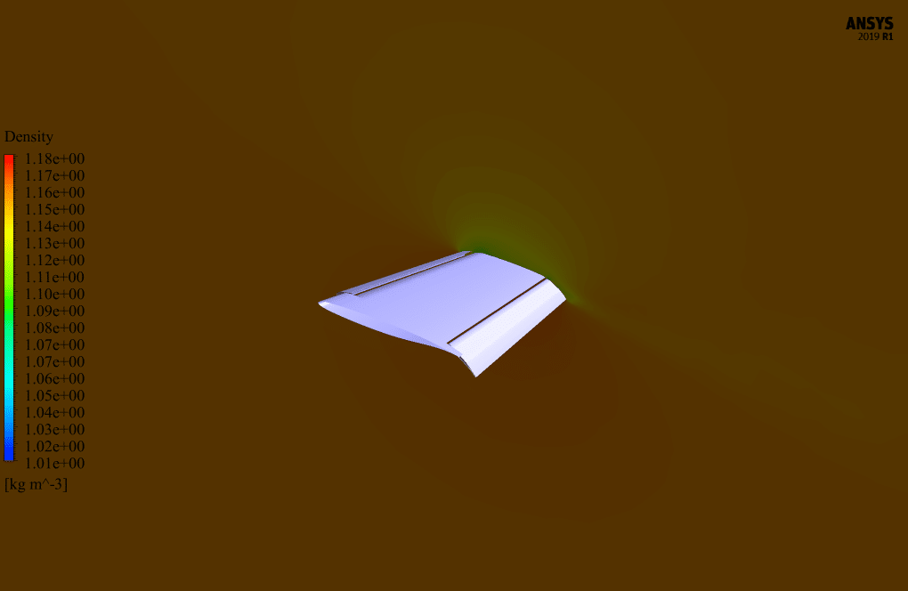 The airflow in the vicinity of the aircraft wing is compressible. This simulation is based on a density-based solver. Also, due to the compressibility of the airflow, the ideal gas model has been used to define the amount of airflow density changes.