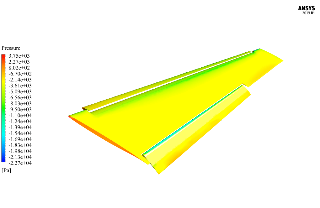 In terms of boundary conditions, airflow velocity in the computational area around the wing is 271.958 m.s-1 along the x-axis and 40.79 m.s-1 along the y-axis. Also, the airflow temperature is equal to 305.5 K.