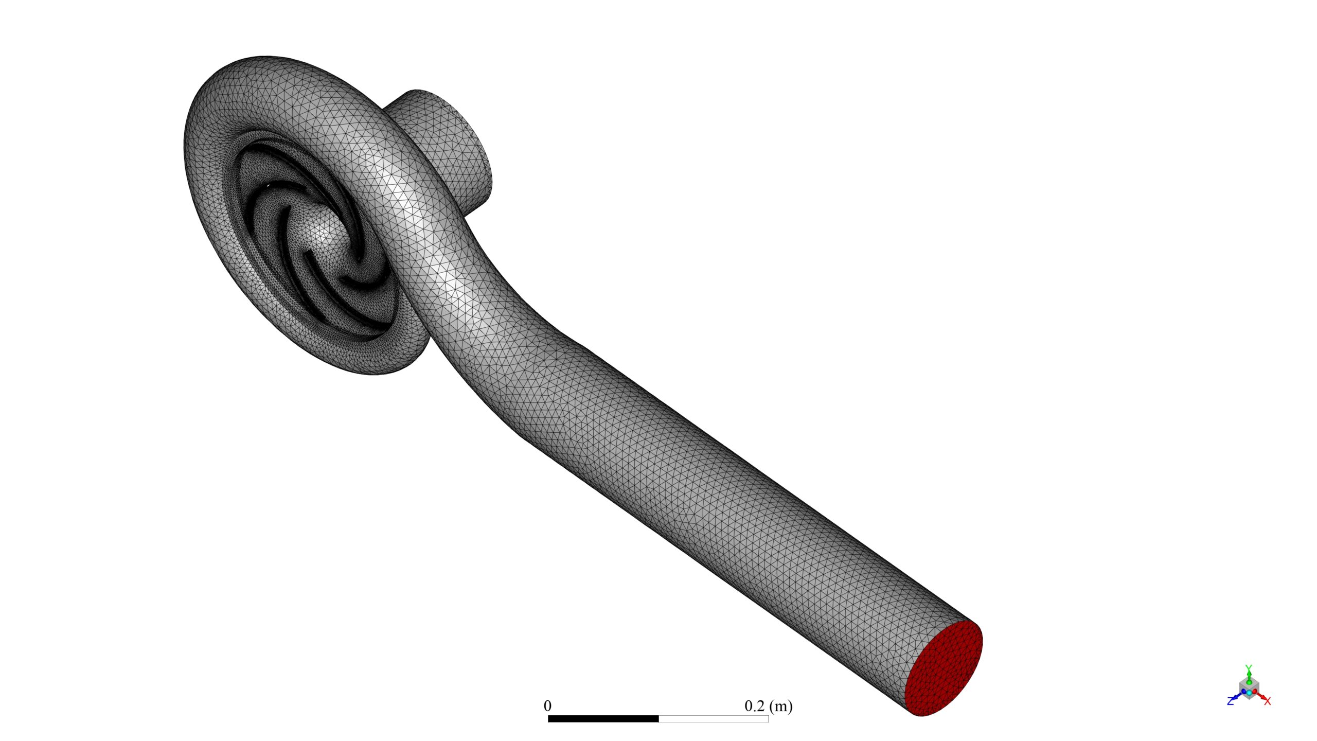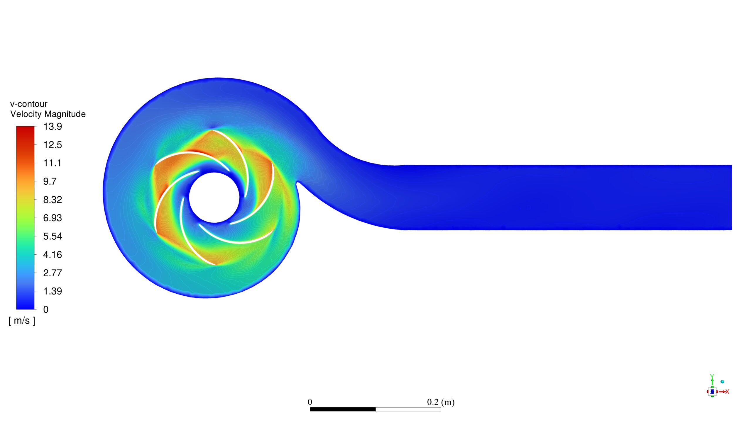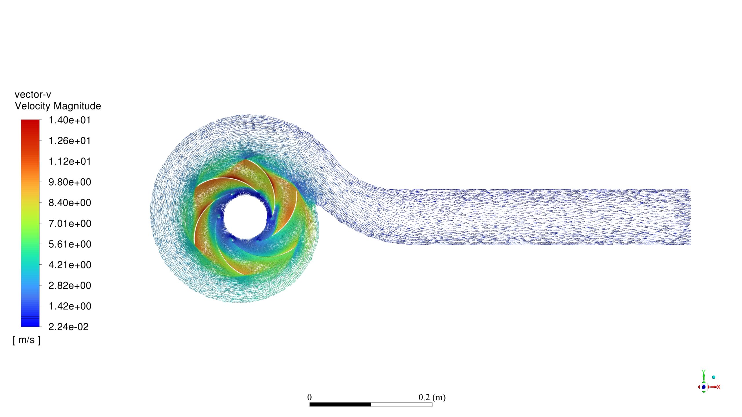 We designed a centrifugal pump in which the computational domain consists of rotating and stationary zones. The flow enters the pump through the stationary part entrance and then turns into the rotational zone. The rotating region of the pump rotates with a rotational speed equal to 1000 rpm. The fluid rotates as the blades rotate and then reaches the pump outlet.