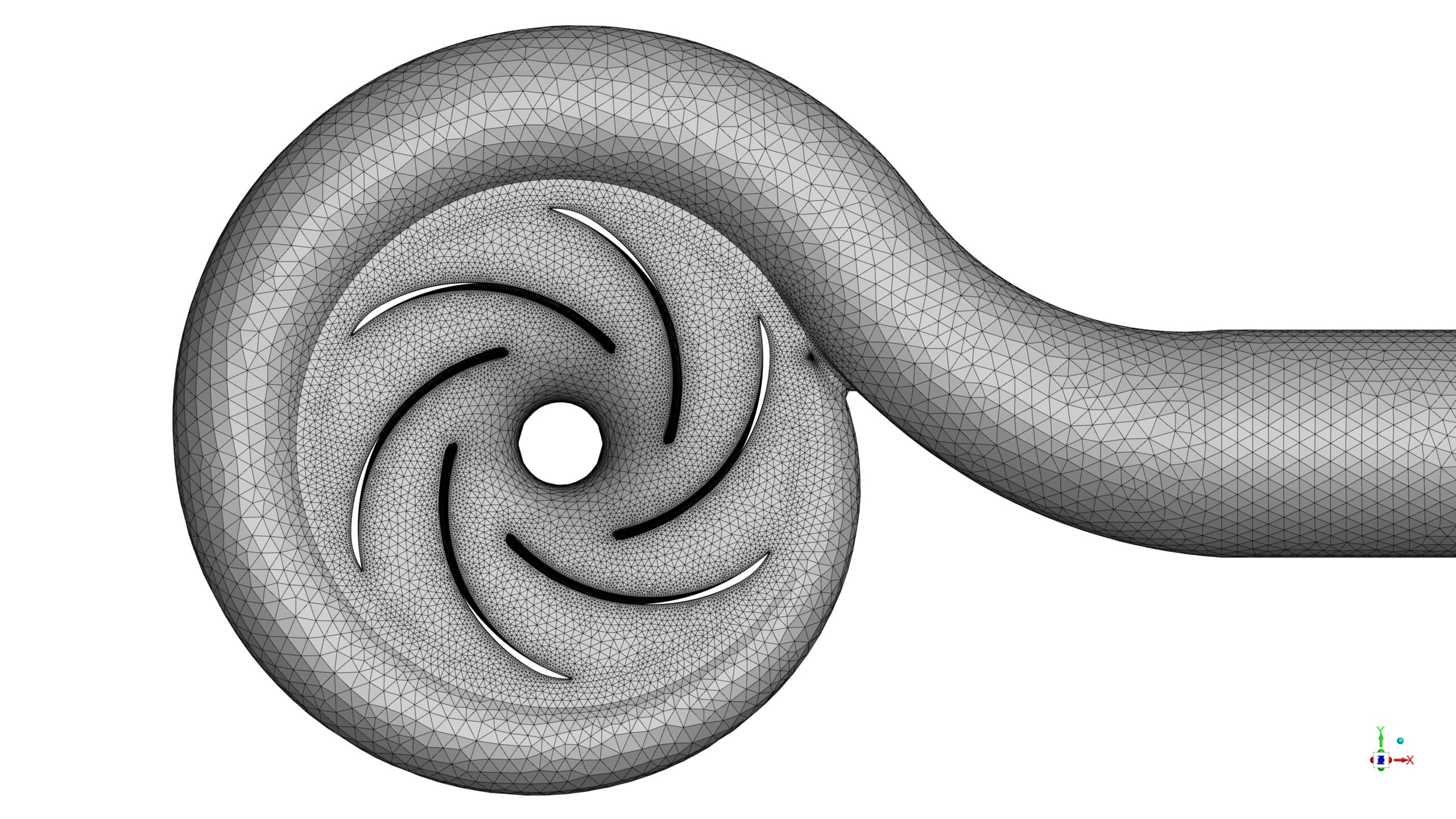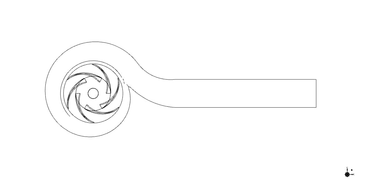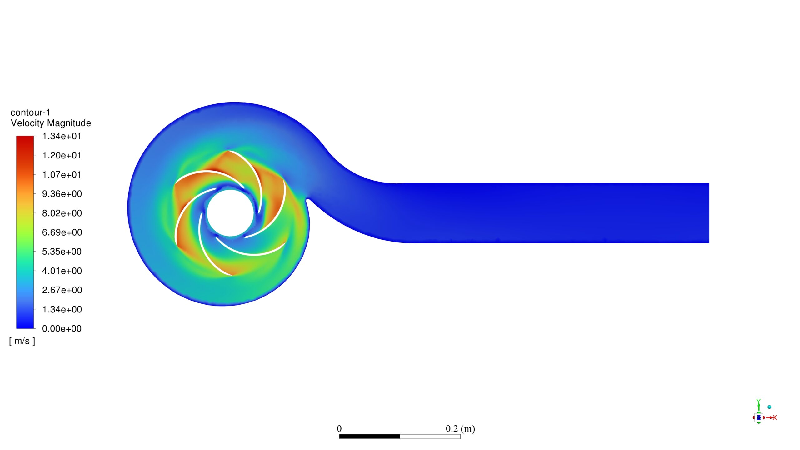 We designed a centrifugal pump in which the computational domain consists of rotating and stationary zones. The flow enters the pump through the stationary part entrance and then turns into the rotational zone. The rotating region of the pump rotates with a rotational speed equal to 1000 rpm. The fluid rotates as the blades rotate and then reaches the pump outlet.