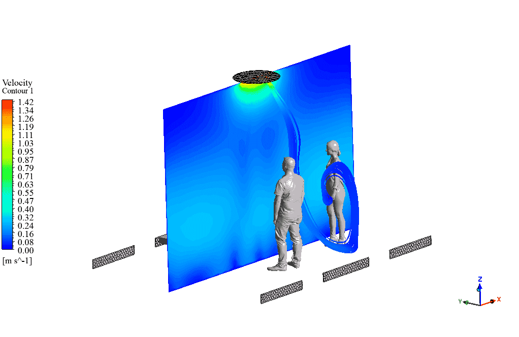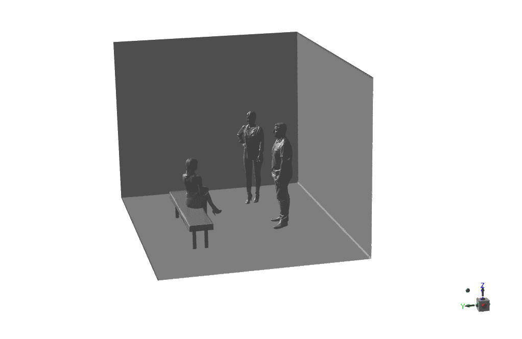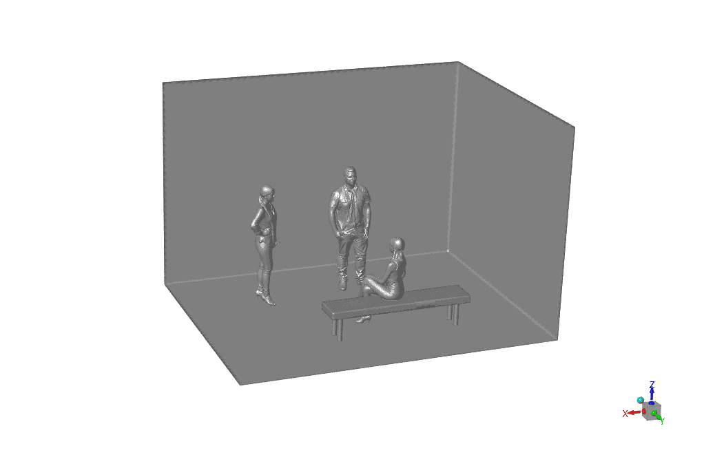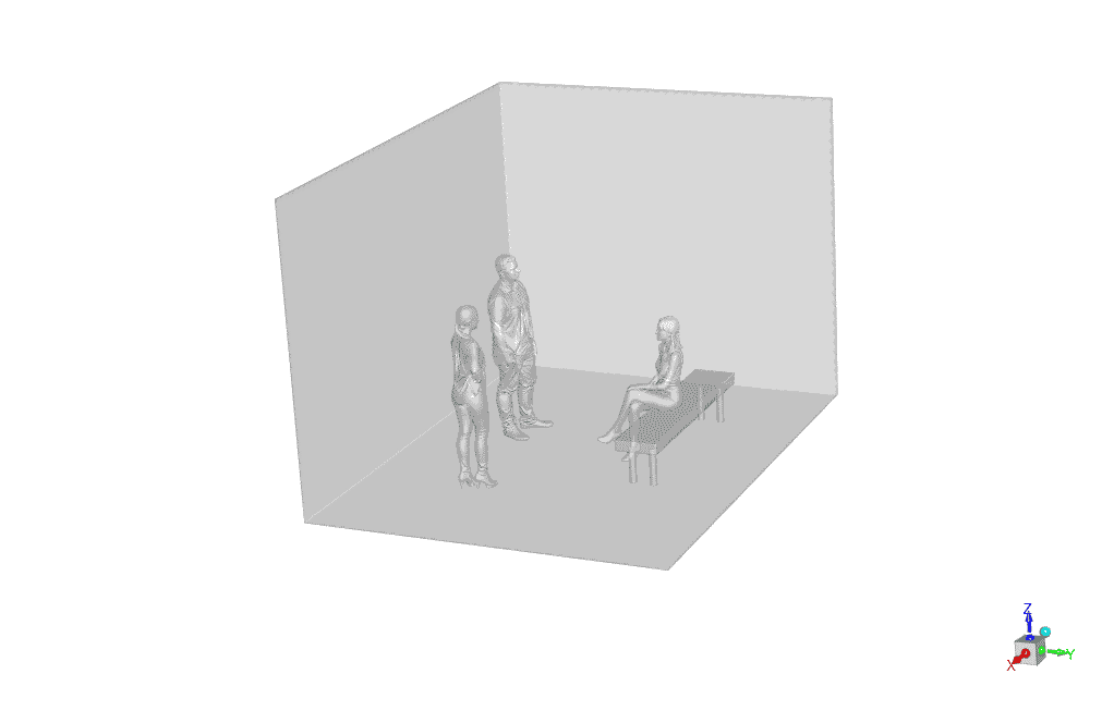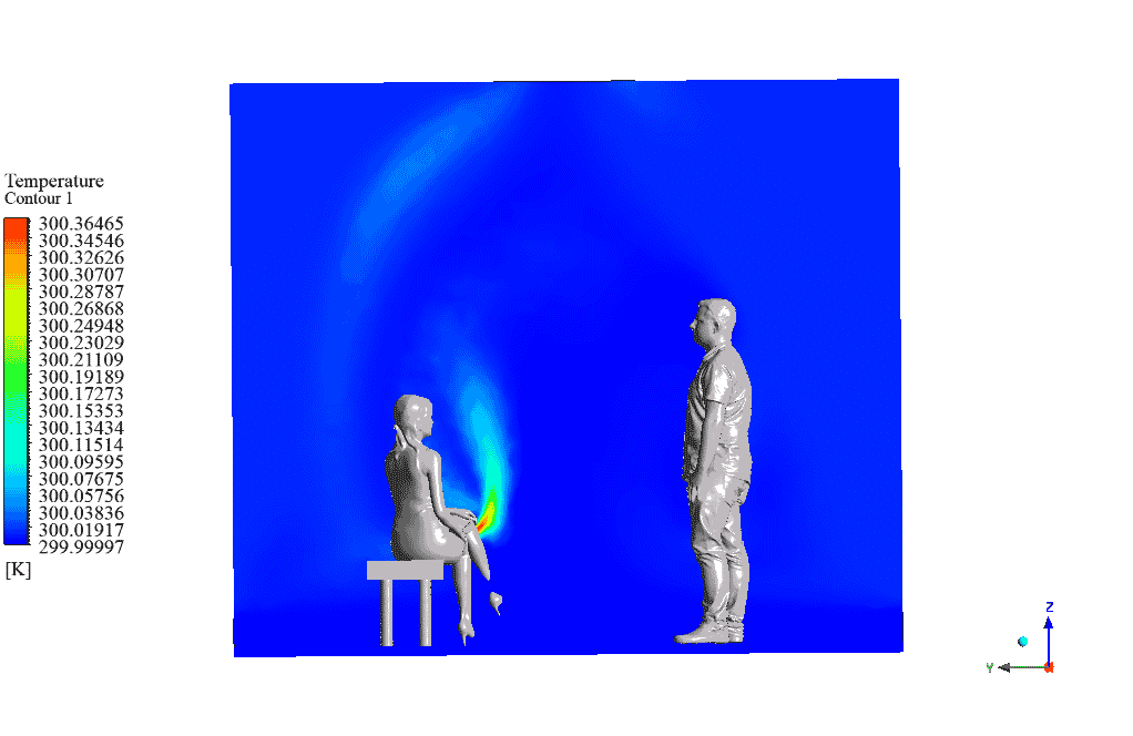 In this simulation, the presence of people is simplified as static objects to capture their influence on airflow and smoke distribution. Their body heat and motion, such as arm movement or breathing, are typically not included in standard room airflow simulations. The people are not moving in this setup; they are predicted shapes that disturb the airflow and influence smoke behavior.