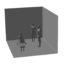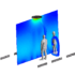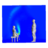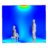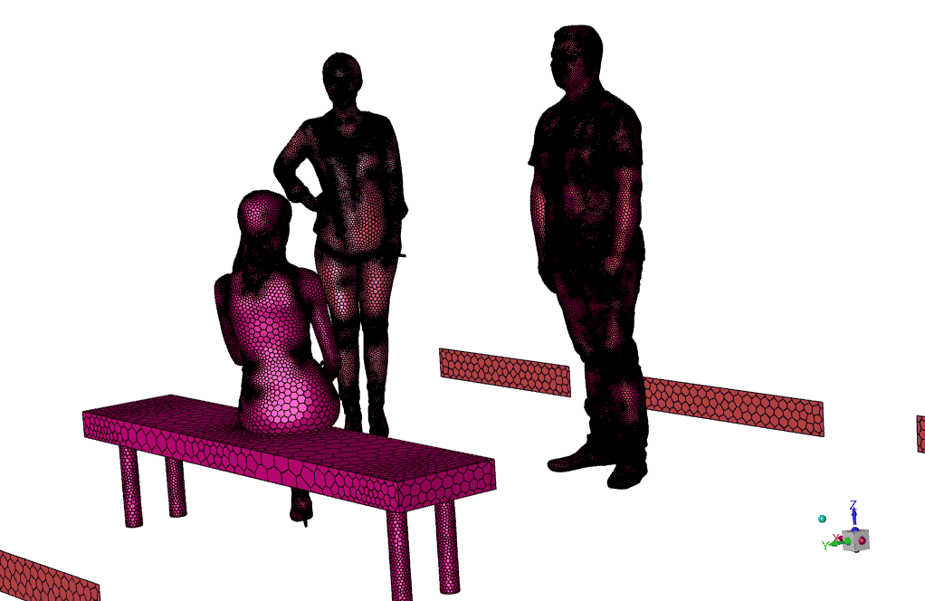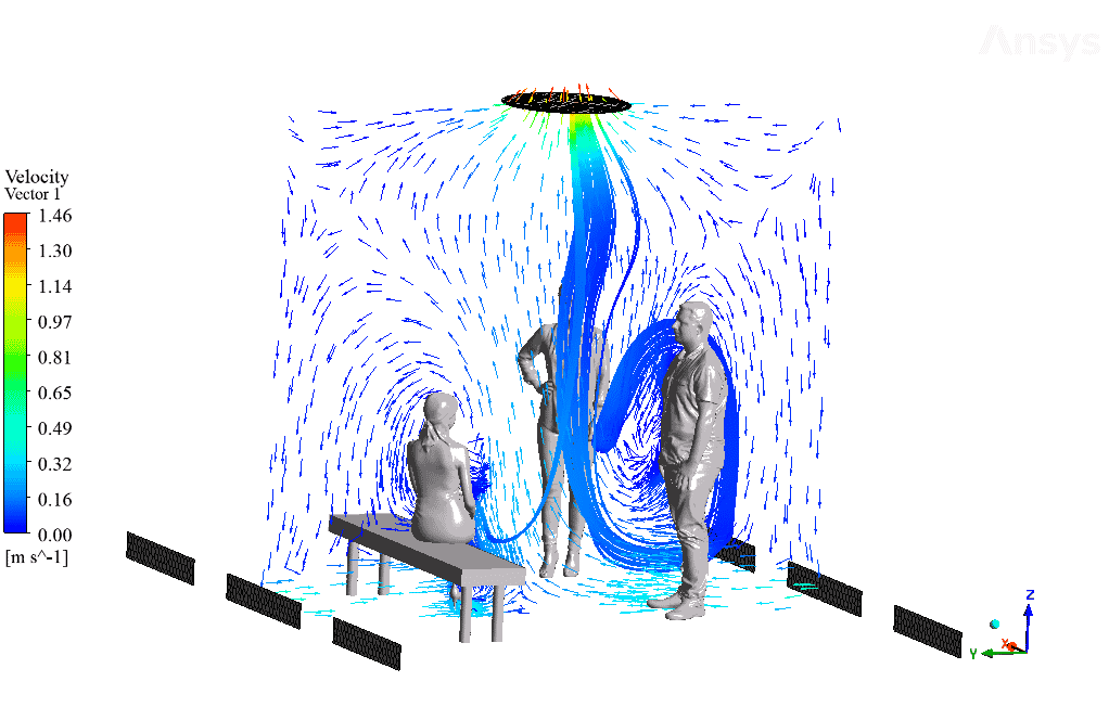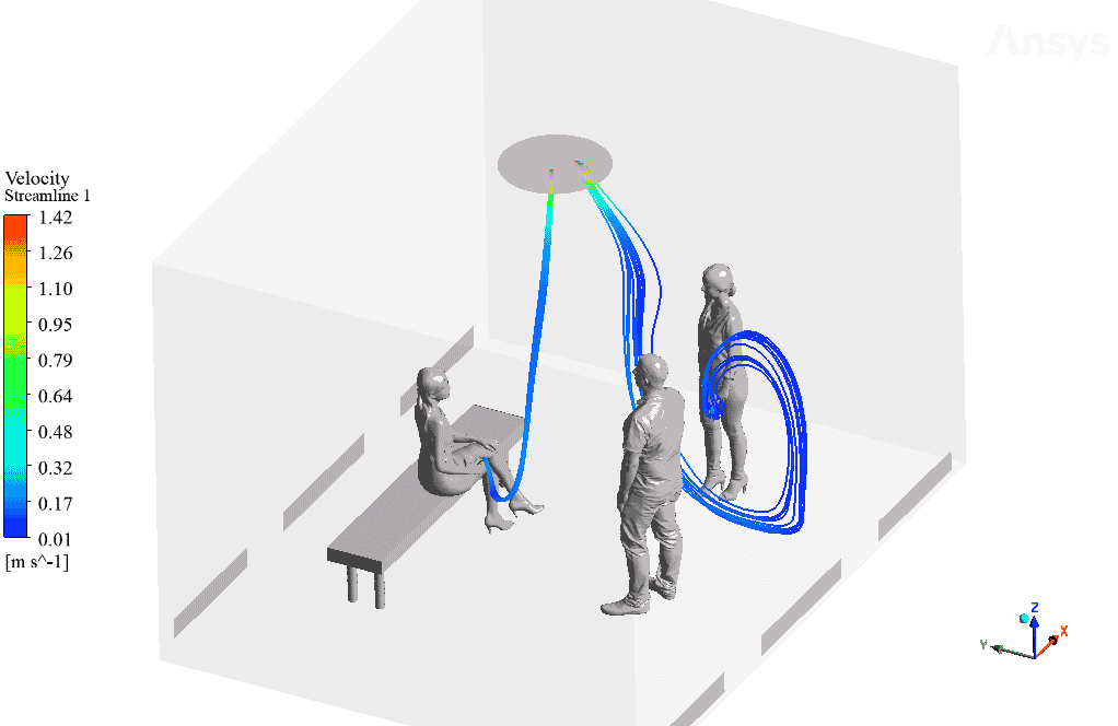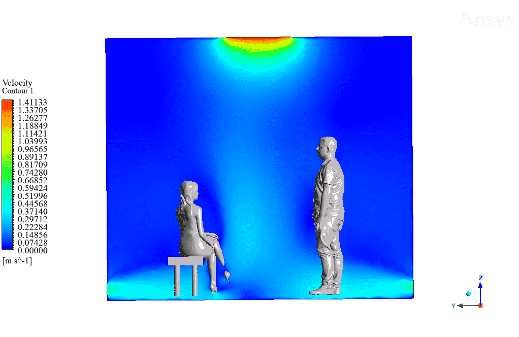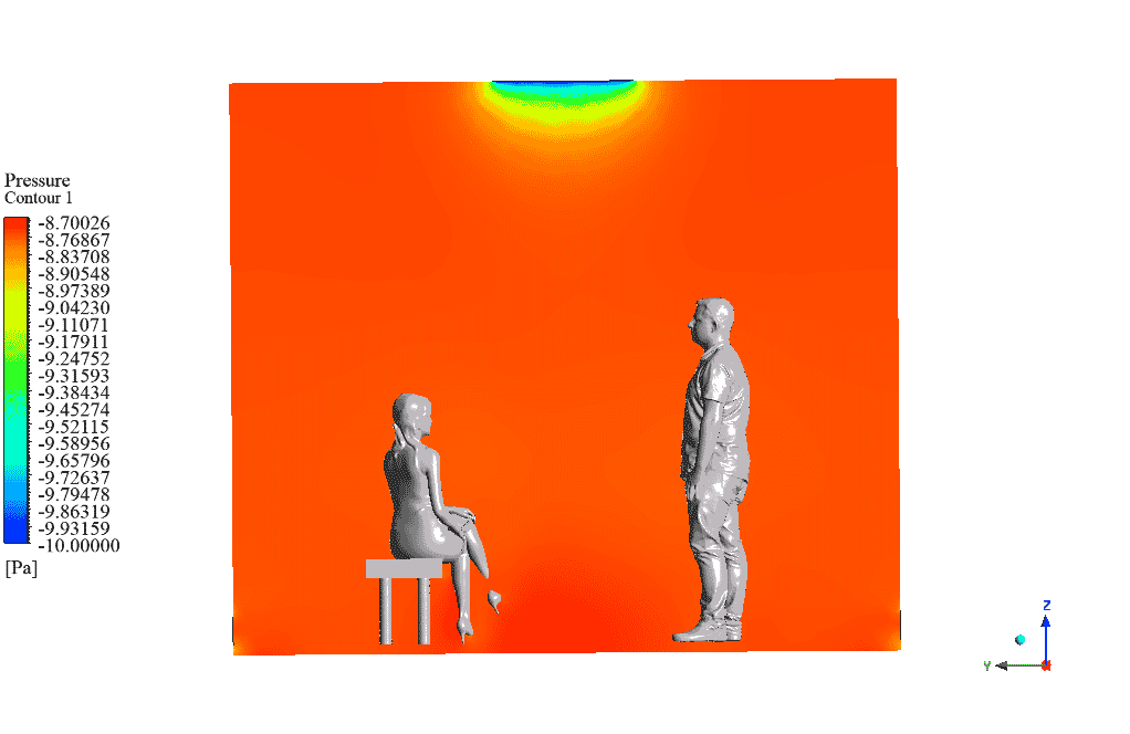 In this simulation, the presence of people is simplified as static objects to capture their influence on airflow and smoke distribution. Their body heat and motion, such as arm movement or breathing, are typically not included in standard room airflow simulations. The people are not moving in this setup; they are predicted shapes that disturb the airflow and influence smoke behavior.
