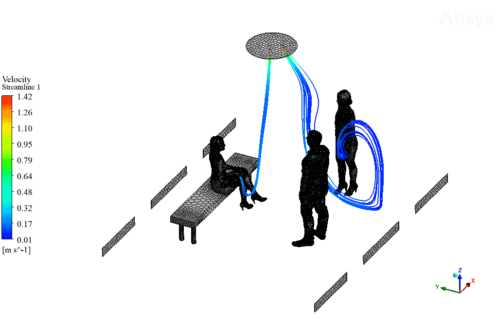 Thank you for appreciating the details in our simulation. Our CFD analysis reveals that the placement of the exhaust fan on the ceiling significantly contributes to the effective removal of cigarette smoke in the room. However, be assured air vortices and intake fan locations were also considered to optimize ventilation. The pathlines of smoke presented in the simulation results show how smoke particles are transported and extracted, reducing the overall smoke concentration where people are seated.