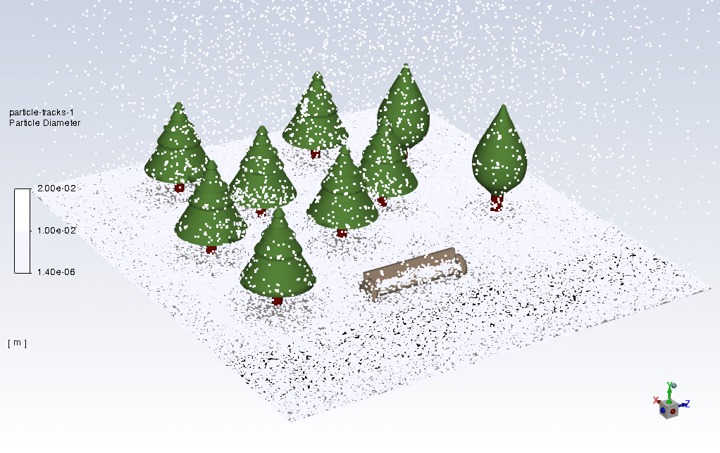 “The trajectories of the snow particles in the simulation are influenced by several factors such as gravity, particle size and distribution, wind velocity, and interaction with various surfaces like benches, ground, and leaves. The DPM model in ANSYS Fluent tracks these influences to simulate snowfall accurately.”