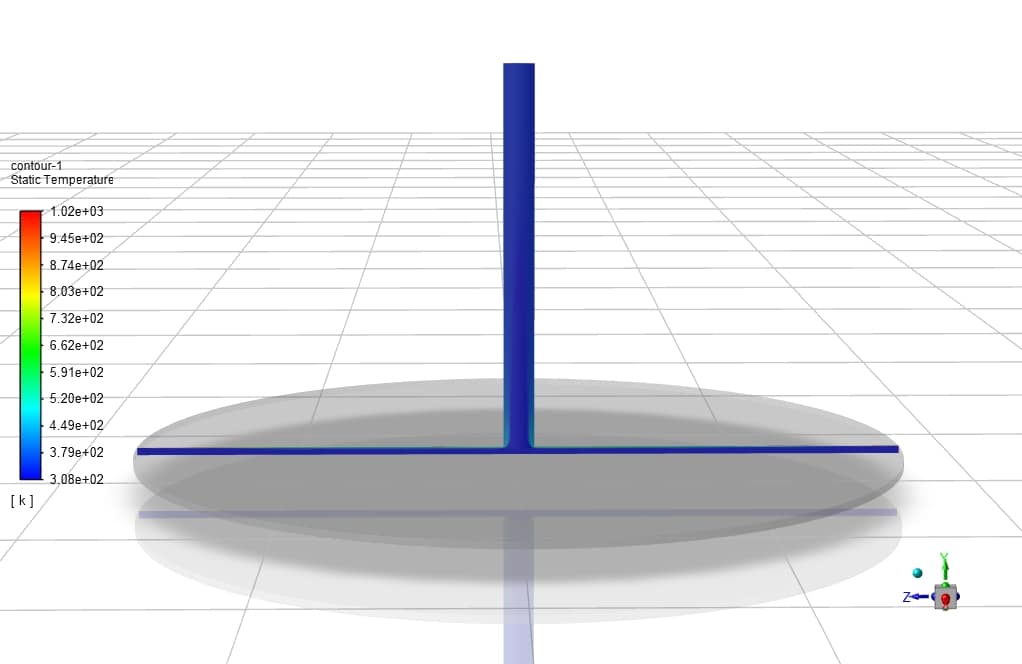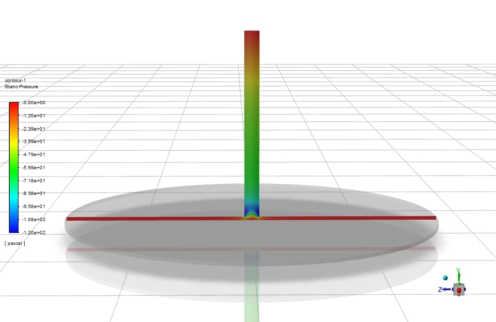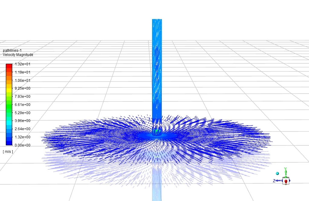 In this project, the airflow enters radially through a pressure inlet boundary with a temperature equal to 308K and passes below a heated wall with a heat flux of 600-800W/m2. The heated air continues to the center of the solar plant, where it can leave the domain through a chimney.