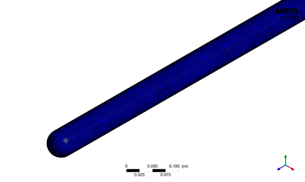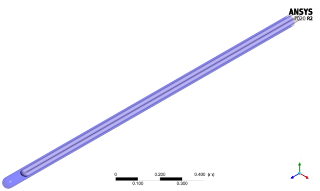 The solar collector geometry was modeled in Design Modeler, featuring a U-shaped tube connected to an inlet and outlet. The model was then imported into ANSYS Meshing to create an unstructured grid consisting of about 1.95 million elements. The mesh was refined near the walls and bends to accurately capture heat transfer and flow gradients. This setup ensures good computational accuracy while keeping the simulation efficient.
