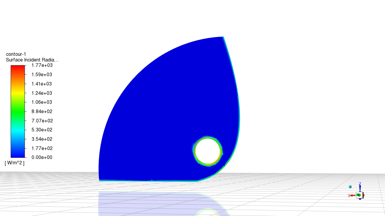 In this simulation, the energy equation has been activated. The radiation model was activated, and the Discrete Ordinates (DO) model was chosen for modeling heat transfer by radiation. Solar ray tracing was used to model the incident rays from the sun. The collector’s walls’ radiation boundary condition was selected as opaque, and both the diffuse fraction and the absorption coefficient were set to zero, so all incident rays to these walls will be reflected.