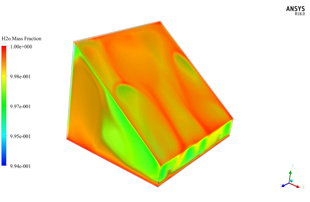 To solve this problem, the Species Transport method is used. When using this method, saline water flow is not simulated in the device, unlike methods such as multiphase simulations that have much heavier computations. This assumes that there is a mixture of air and vapor inside the chamber interior. In fact, the simulation focuses solely on the amount of vapor produced in the system, and the purpose of the present study is to investigate the amount of vapor produced on the water surface and the cold surface of the sloping plate.