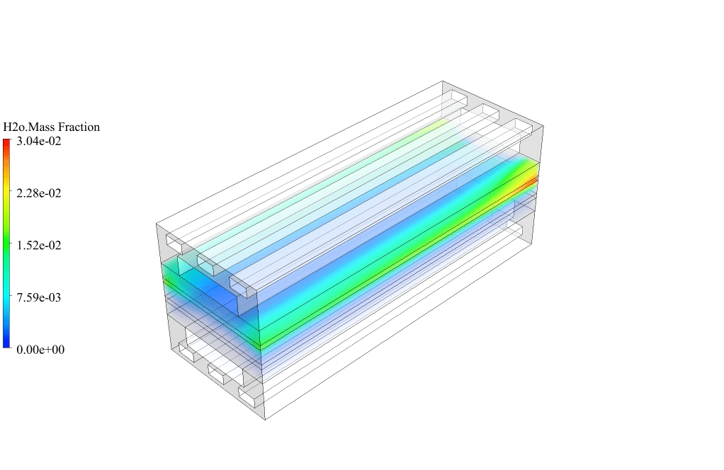 In our SOFC simulation with a cooling system, the cooling channels play a crucial role in maintaining optimal operating temperatures despite the high intrinsic temperature of fuel cell operation. These channels help prevent overheating by dissipating excess heat away from active cell areas, which supports sustained chemical reactions and prolongs the cell’s lifespan. Temperature regulation achieved by cooling channels contributes to the fuel cell’s efficiency and prevents thermal-related degradation or failure, ensuring a stable production of electricity.
