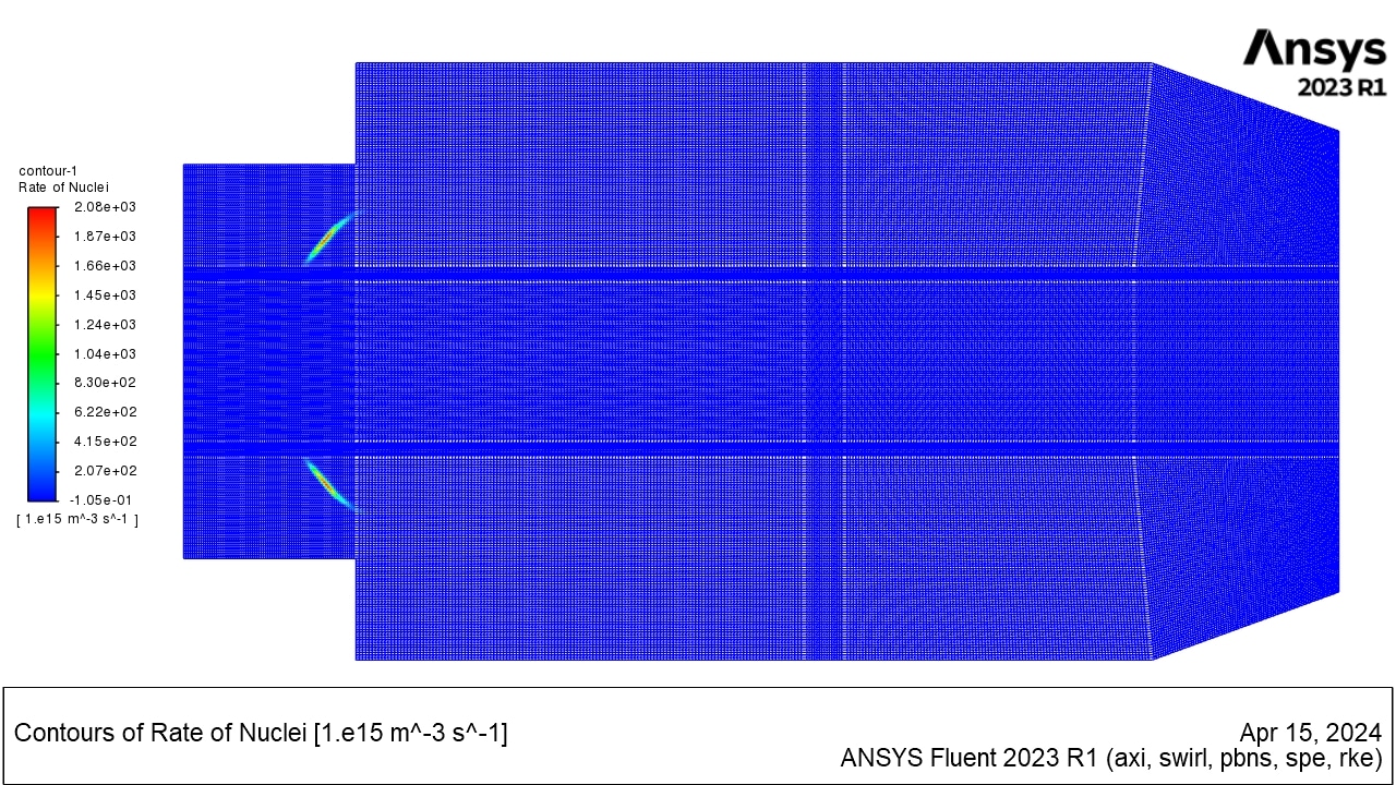 In this simulation, we aim to simulate the soot formation process (as outlined above) within a model gas turbine combustor, featuring swirl air and fuel inlet flow, along with a secondary air flow to ensure that the flame remains away from the combustor walls.
