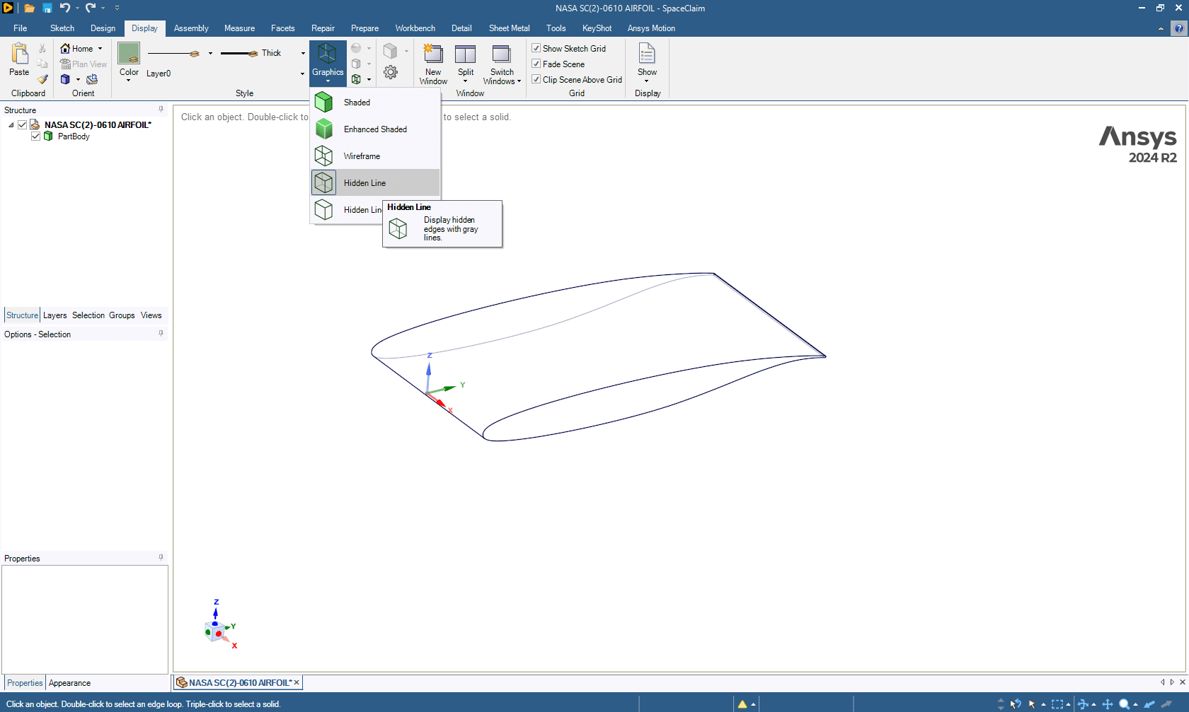 - Hidden Line: Displays both visible and hidden edges of the geometry, so the user can see the lines behind surfaces.