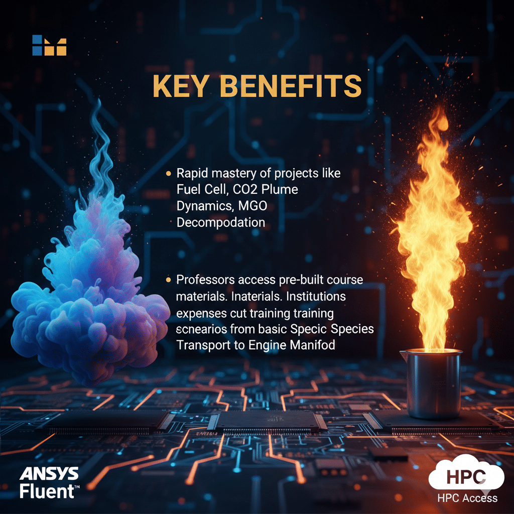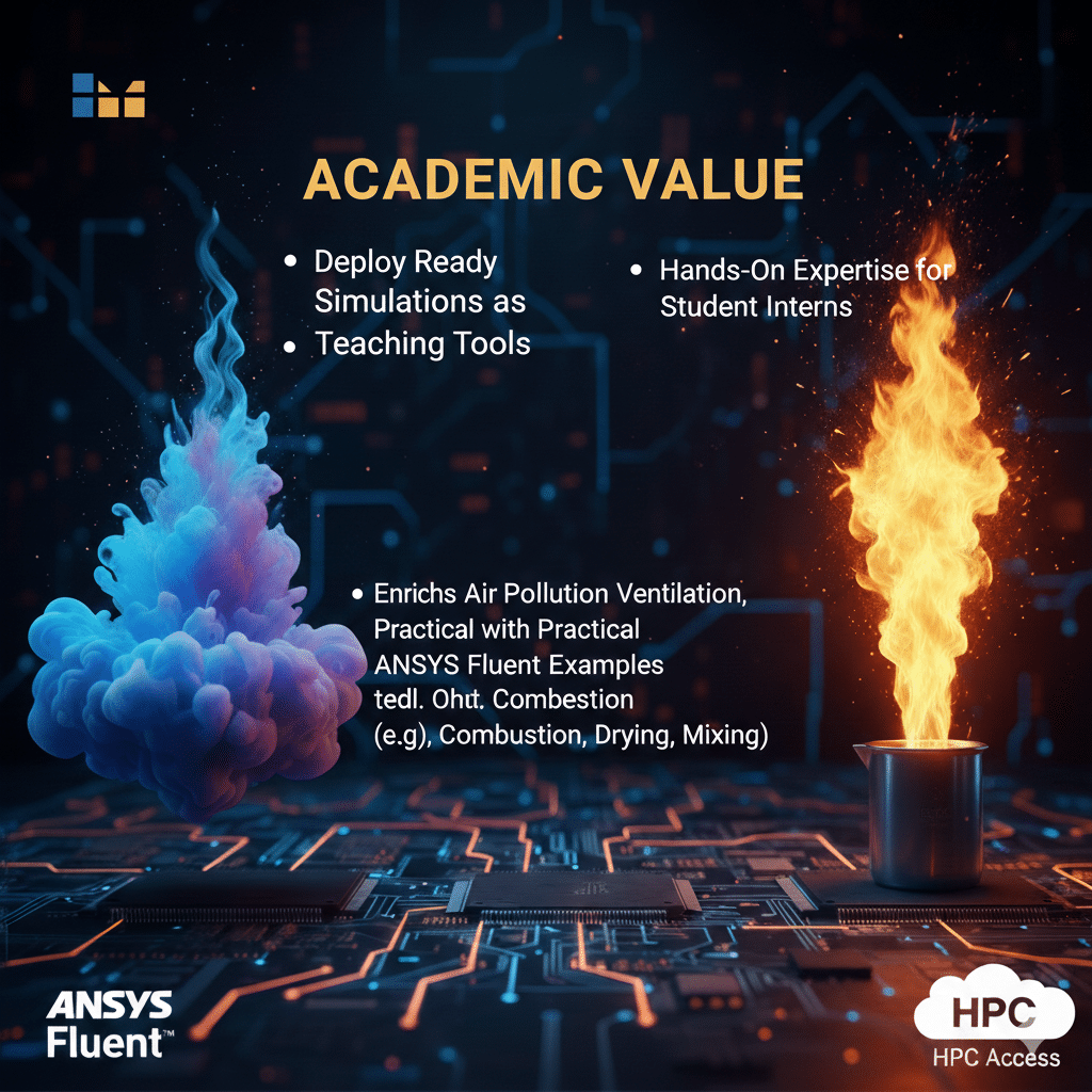 Professors deploy ready simulations as teaching tools, enriching curricula with practical ANSYS Fluent examples for the Combustion, Drying, Mixing, and beyond. Interns gain hands-on expertise through structured, deployable content.
