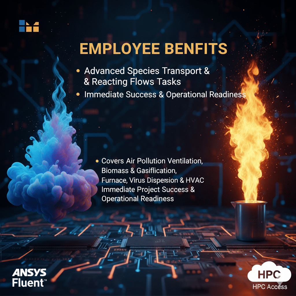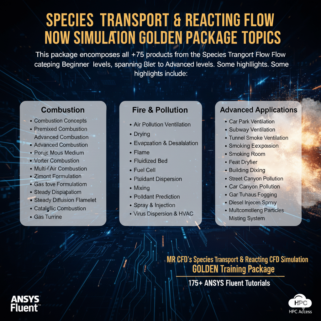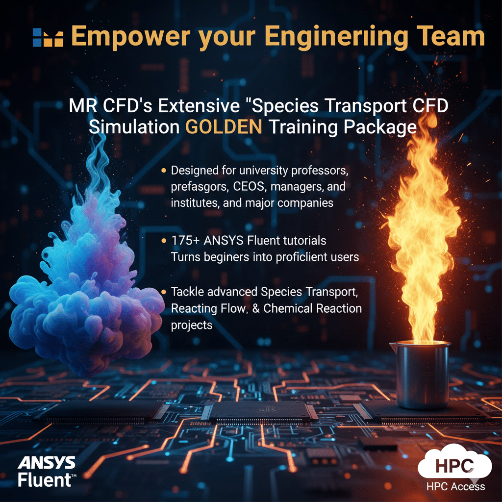 MR CFD’s Species Transport & Reacting Flow CFD Simulation GOLDEN Training Package offers 175+ ANSYS Fluent tutorials on species modeling, combustion, pollution dispersion, and chemical reactions, perfect for professors, managers, and companies to rapidly upskill teams. It includes 1-year support and 3 months HPC from 15 years’ expertise.