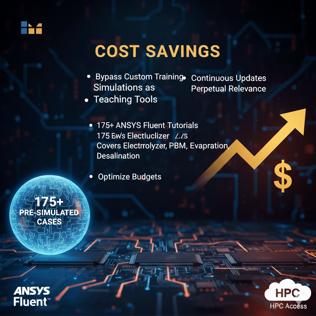 Organizations bypass custom training by leveraging over 175 pre-simulated cases, from Electrolyzer and PBM to Evaporation and Desalination, optimizing budgets. Continuous updates maintain relevance across all Species Transport & Reacting Flows challenges.