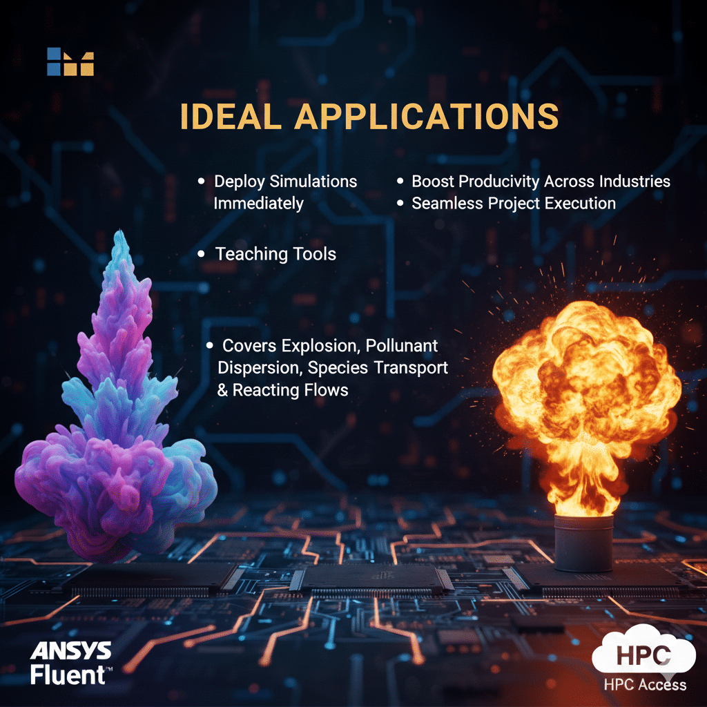 Teams gain immediate capabilities for deploying simulations in Explosion, Pollutant Dispersion into the Air, Species Transport & Reacting Flows Flow analysis, boosting productivity across industries. This comprehensive resource supports seamless project execution without extensive prior experience.