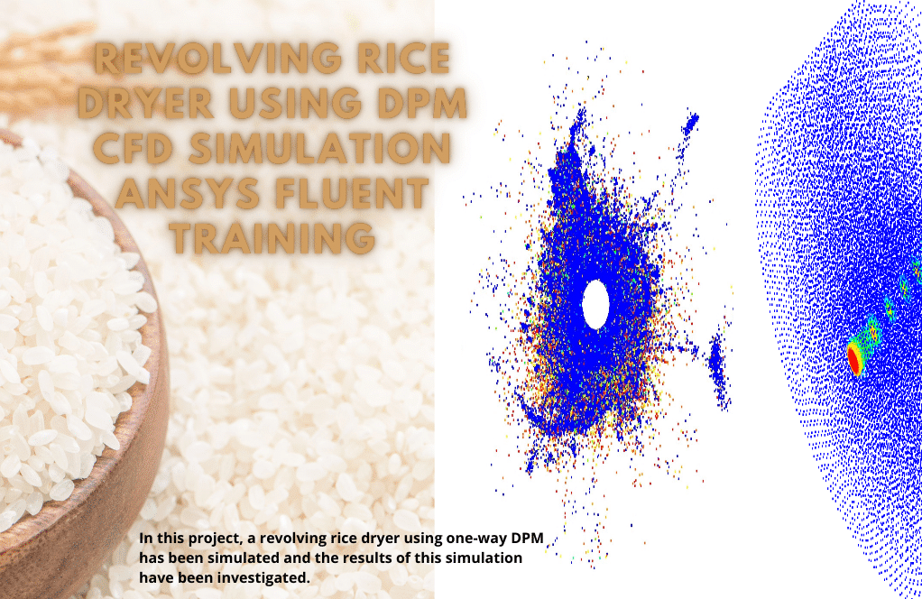In project number 5, a rice drying device has simulated using the Two-way Discrete Phase Model (DPM) & Species Model, and then the results were investigated. Hot air enters the drying device, and then 120000 rice grains with 10% moisture are injected randomly for 6 seconds. The evaporation process continues for 9 seconds after the complete injection. Furthermore, the hot surfaces are in contact with the hot exhaust smoke of the engine, which provides an efficient condition for the drying device.