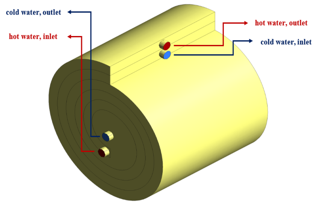 The present problem concerns the simulation of a spiral heat exchanger by ANSYS Fluent software. In this spiral path, two paths for cold water and hot water are used so that the temperature difference between the two water flows causes heat transfer. The hot flow enters the central part of the heat exchanger and exits the heat exchanger environment (laterally) in a perpendicular direction to the inlet area, while the cold current has the opposite direction of the hot stream and enters the heat exchanger environment (laterally) and exits from the central part of the heat exchanger in a direction perpendicular to the input path. The coil plates are embedded between two hot and cold flow paths made of steel with a thickness of 0.01 m. The exterior wall of the model is also made of steel.