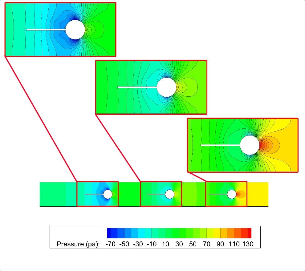The pressure contours indicate high-pressure areas at the leading edge of the cylindrical pins and low pressure in their wake. The splitter plates create additional pressure gradients, which can help break up the wake region and promote turbulent mixing. This effect is particularly noticeable in the varying pressure patterns observed along the length of the heat sink.