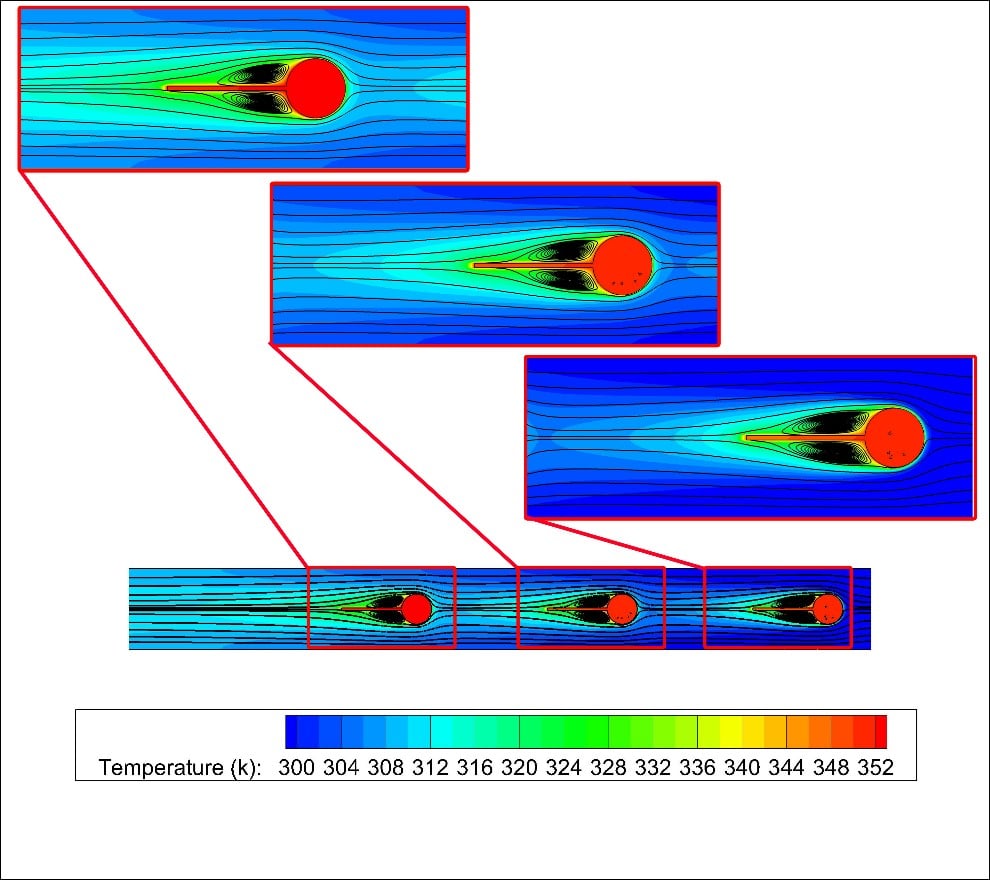 The temperature contours show a gradual increase in fluid temperature as it flows across the heat sink. The cylindrical pins effectively extend the heat transfer surface area, creating localized high-temperature regions around each pin. The splitter plates appear to influence the temperature distribution in the wake region of the pins, potentially enhancing heat transfer in these areas.