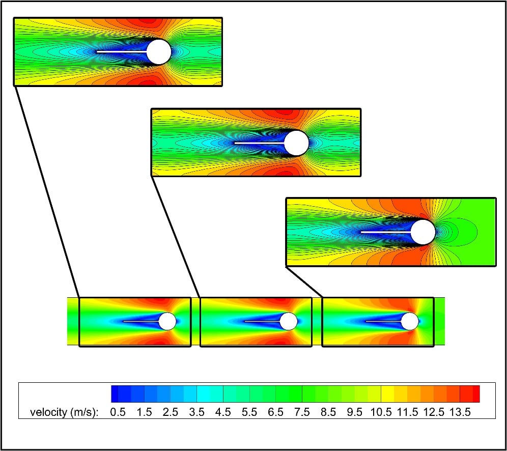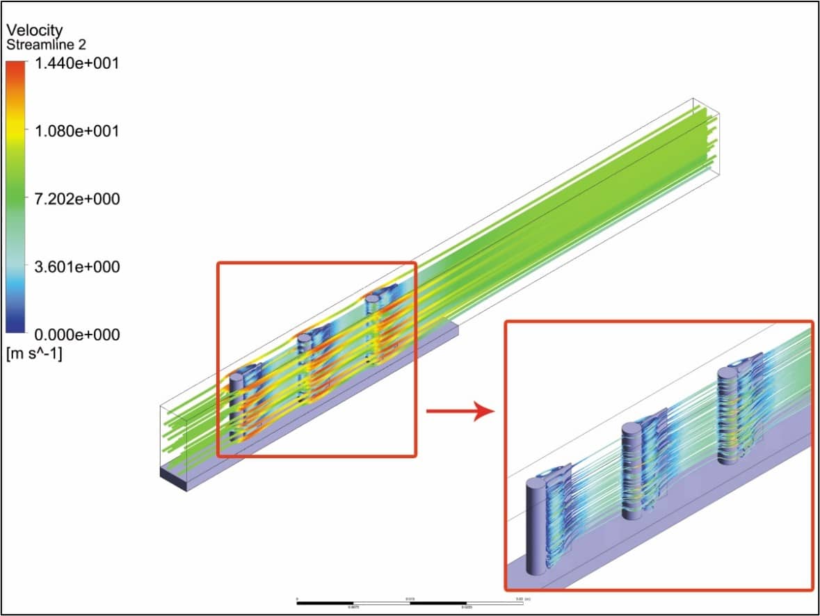 The velocity streamline visualization provides crucial insights into the flow behavior. The flow accelerates as it passes between the pins and splitter plates, reaching velocities up to 14.4 m/s. The splitter plates effectively guide the flow, creating complex vortex structures in the wake of the pins. This increased turbulence and mixing can lead to enhanced heat transfer from the pin surfaces to the fluid.