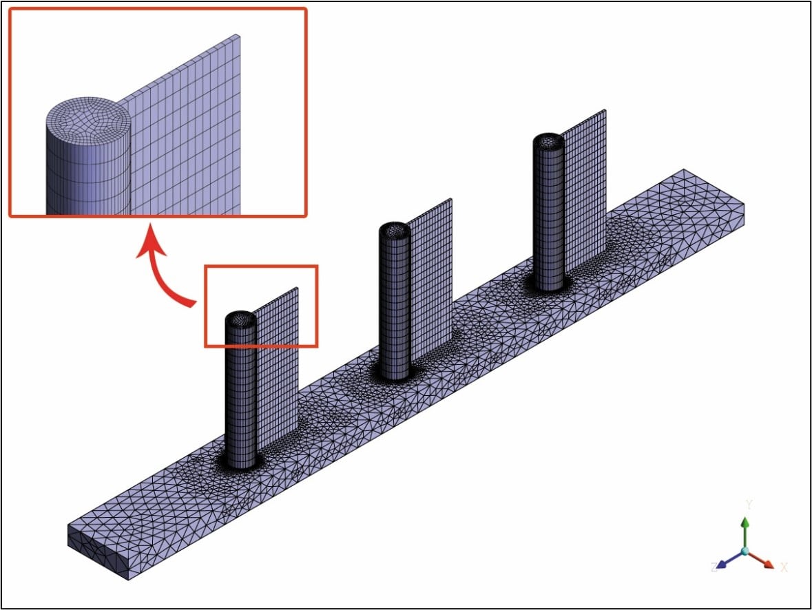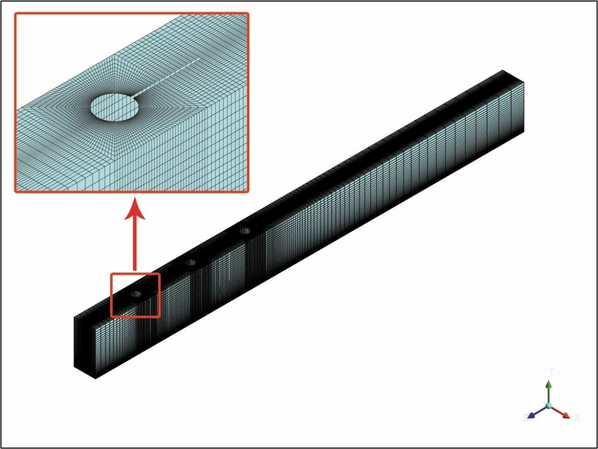 The CFD simulations were conducted using ANSYS Fluent software. The geometry was designed in ANSYS Design Modeler and meshed using ANSYS Meshing software, resulting in a high-fidelity structured mesh of 804,434 elements.