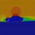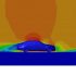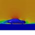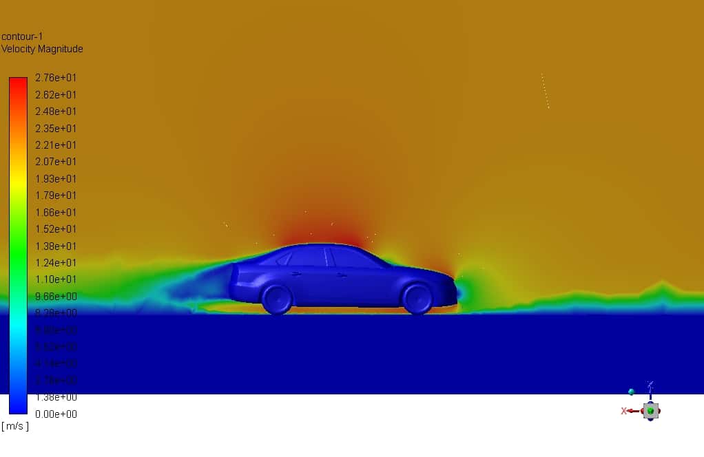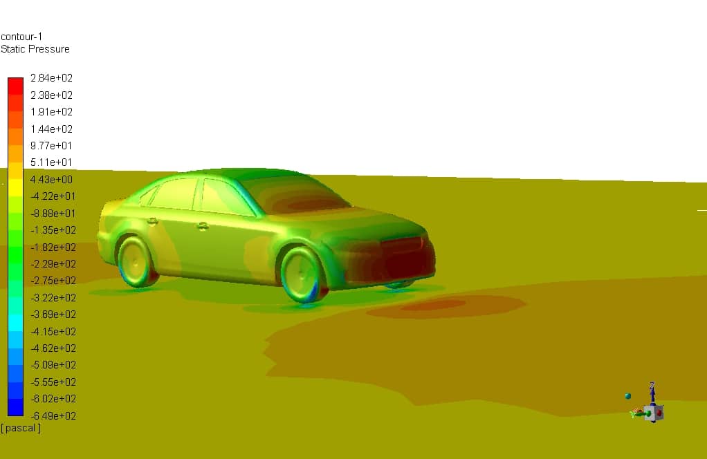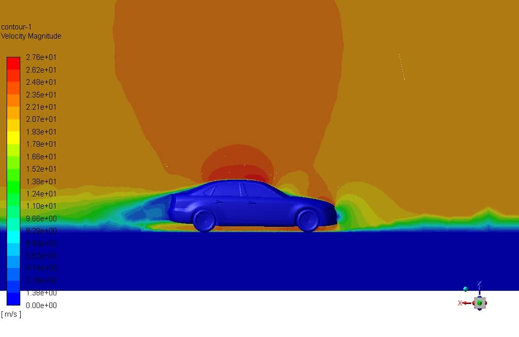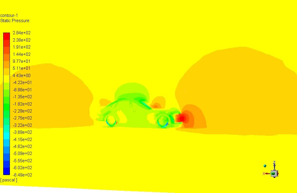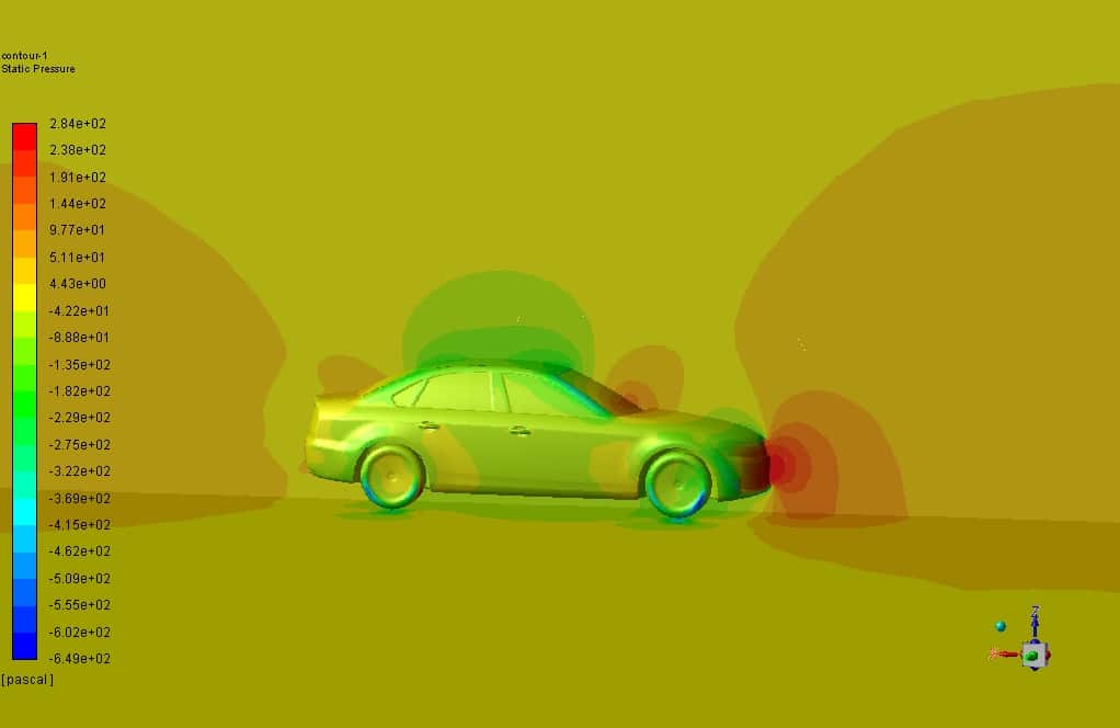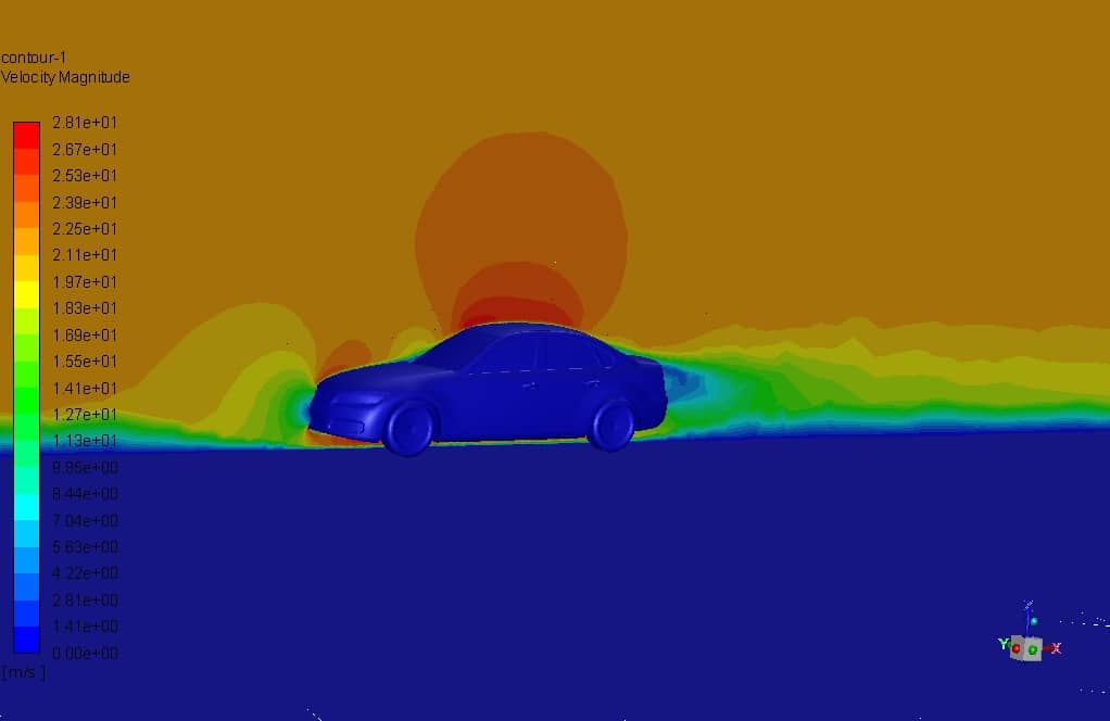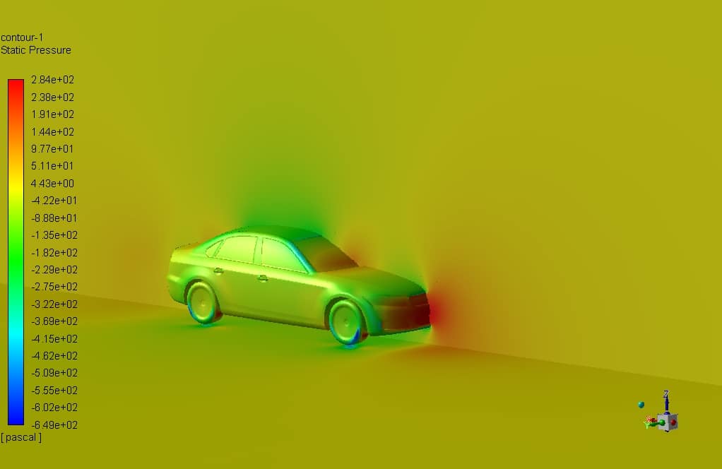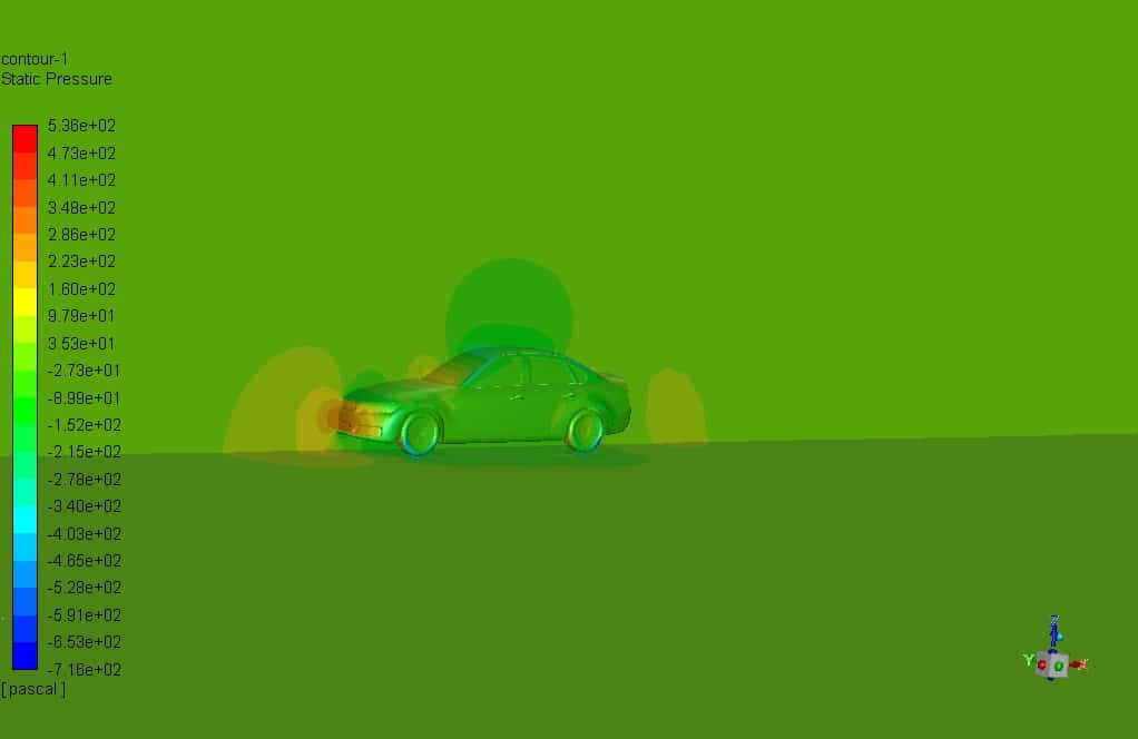 At the end of the solution process, two-dimensional contours related to pressure and velocity are obtained. As seen in the pressure contour, the pressure increases at the stagnation point on the car’s front section.